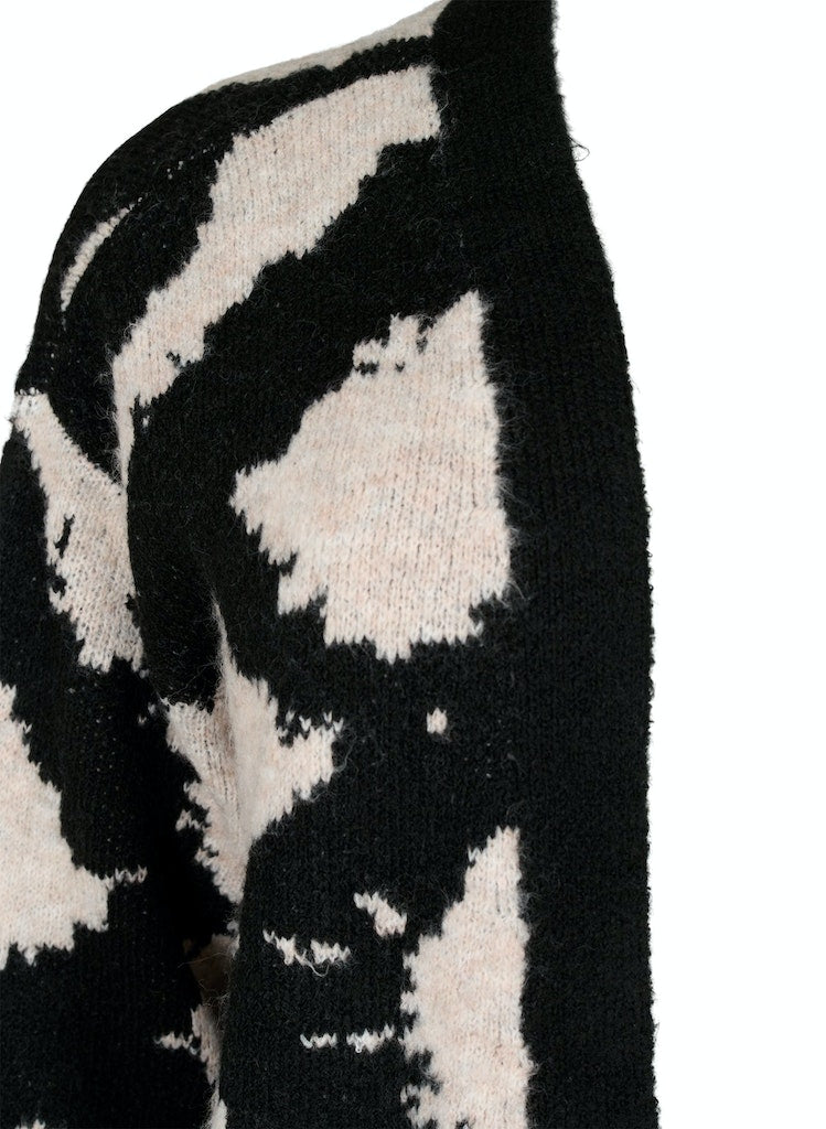 Peysan er ljósgrá og svört með skemmtilegu abstrakt mynstri.