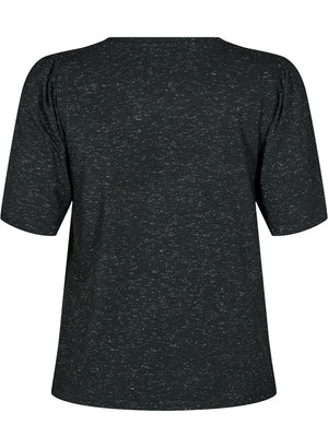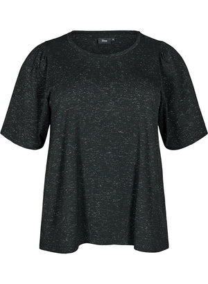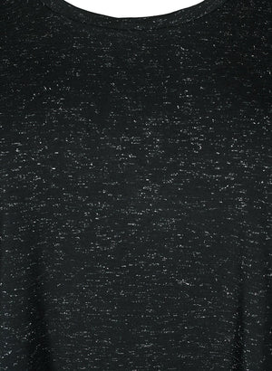 Toppurinn er með rúnnuðu hálsmáli, aðeins lausar hálfar ermar og smáum glitrandi þráðum í efninu.