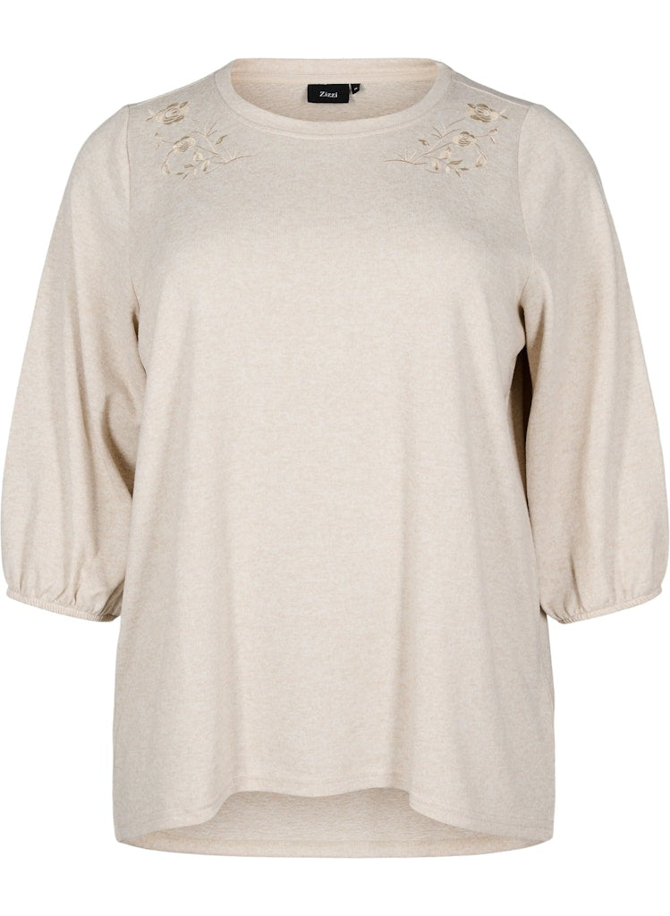 Rúnnað hálsmál með blóma útsaum sitthvoru megin á öxlunum.
