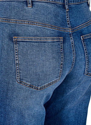 Vandaðar og góðar gallabuxur frá Zizzi. Gemma sniðið er extra hátt upp í mittið með beinum víðum skálmum.