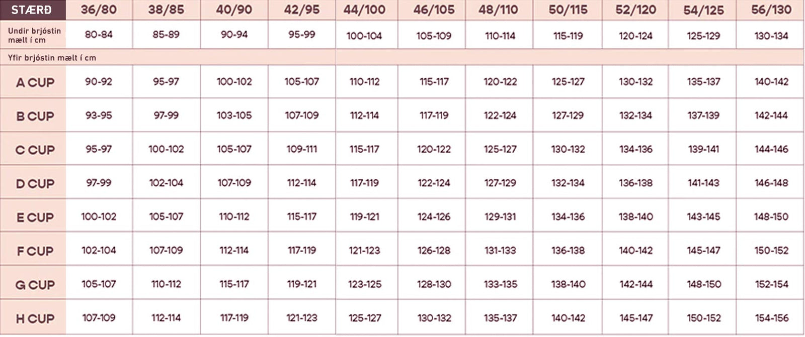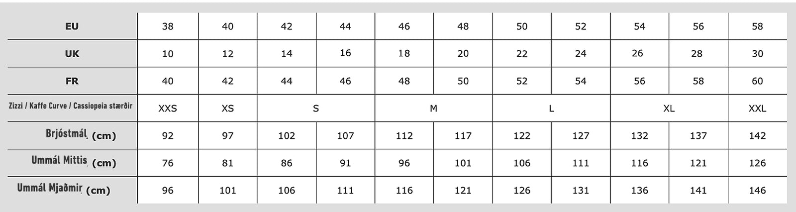 Við í Curvy förum eftir Evrópskum stærðar númerum sem eru frá 42-60. Hér koma nokkrar stærðartöflur sem geta hjálpað þér að finna út hvaða stærð þú ert mögulega að nota hjá okkur. þessar stærðartöflur eru aðeins til viðmiðunnar. Þú ert alltaf velkomin að hafa samband í síma 581-1552 eða senda okkur línu á facebook ef þig vantar aðstoð við mælingar.