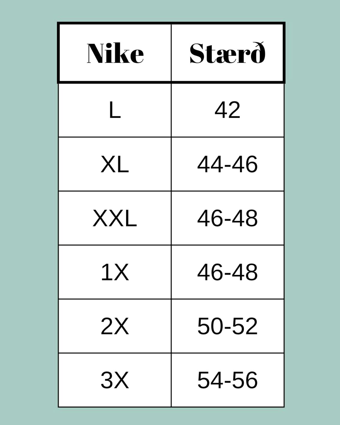 Í Curvy fást vinsælu Nike vörurnar í stærðum frá L-3XL. Hér sérðu Nike stærðirnar bornar saman við EU númerin sem Curvy fer eftir.