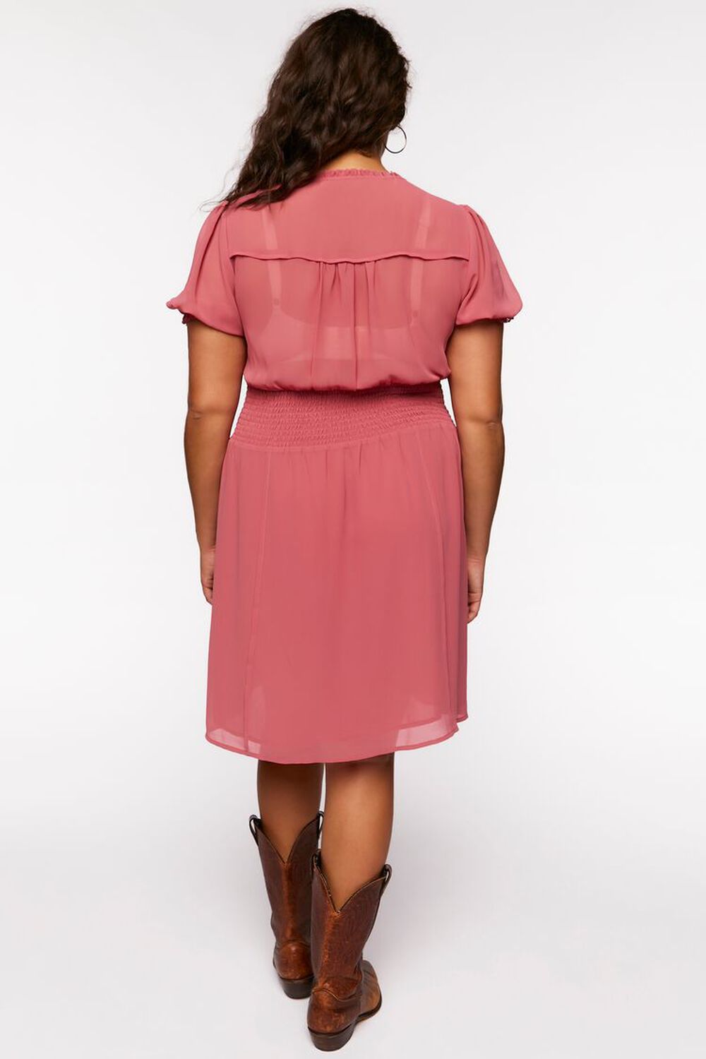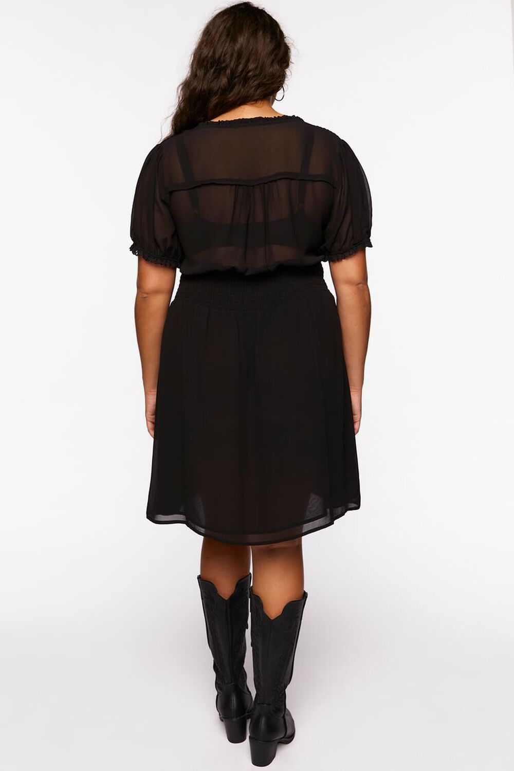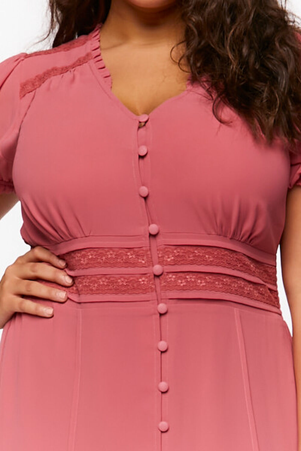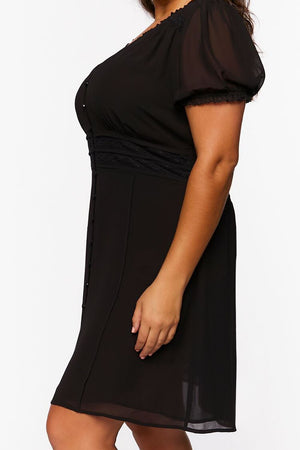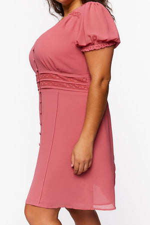 Stuttar púff ermar og smá pífu skraut og blúnda er á kjólnum.