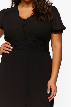 Kjóllinn er með V-laga hálsmáli og tölum alla leið niður,