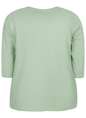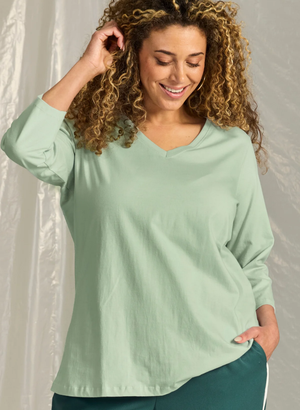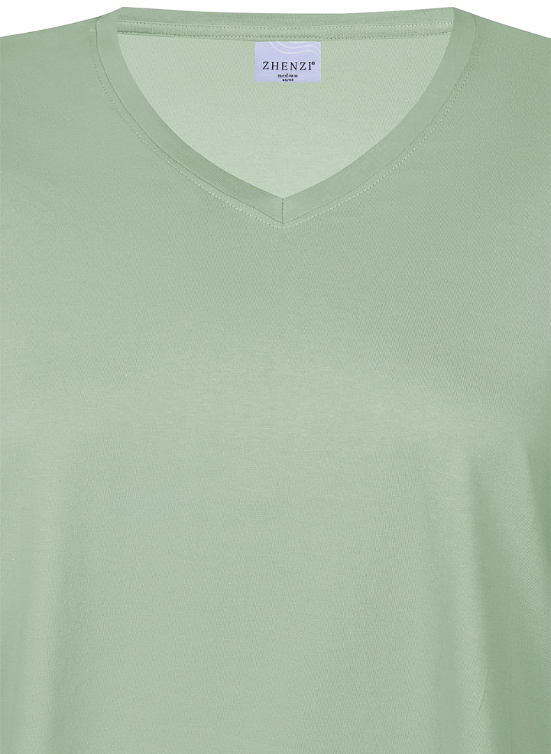 V-hálsmál og ermar sem ná niður fyrir olboga.