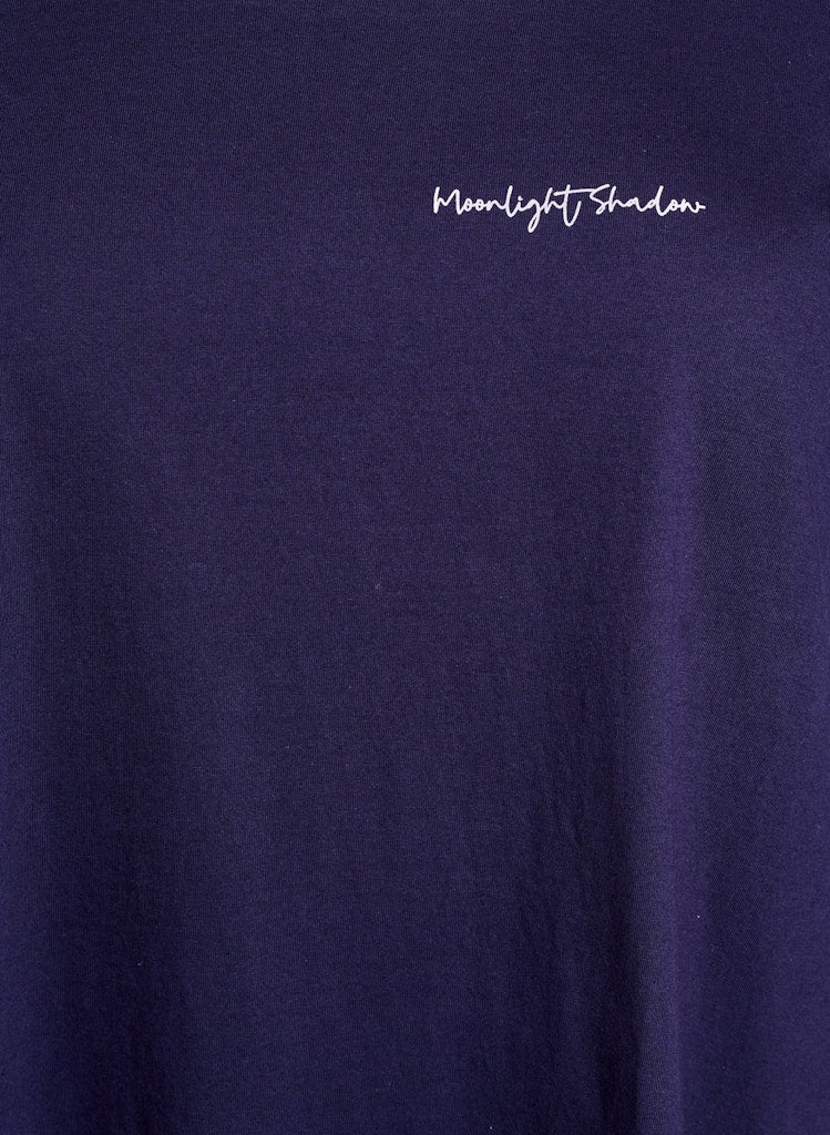 Dökkblár í grunninn með áprentaðri grafík að aftan og smáaletri að framan sem segir "moonlight shadow ".