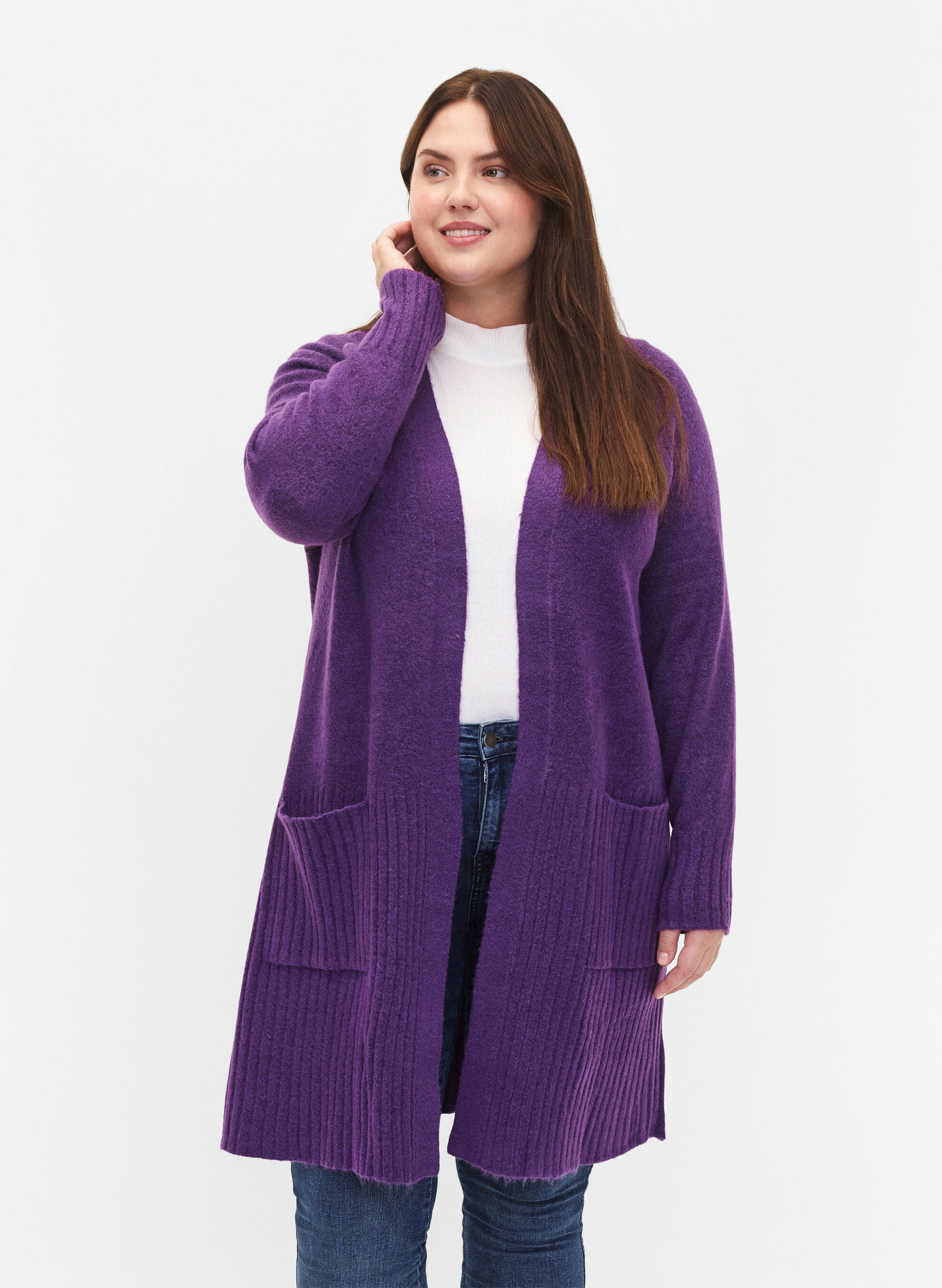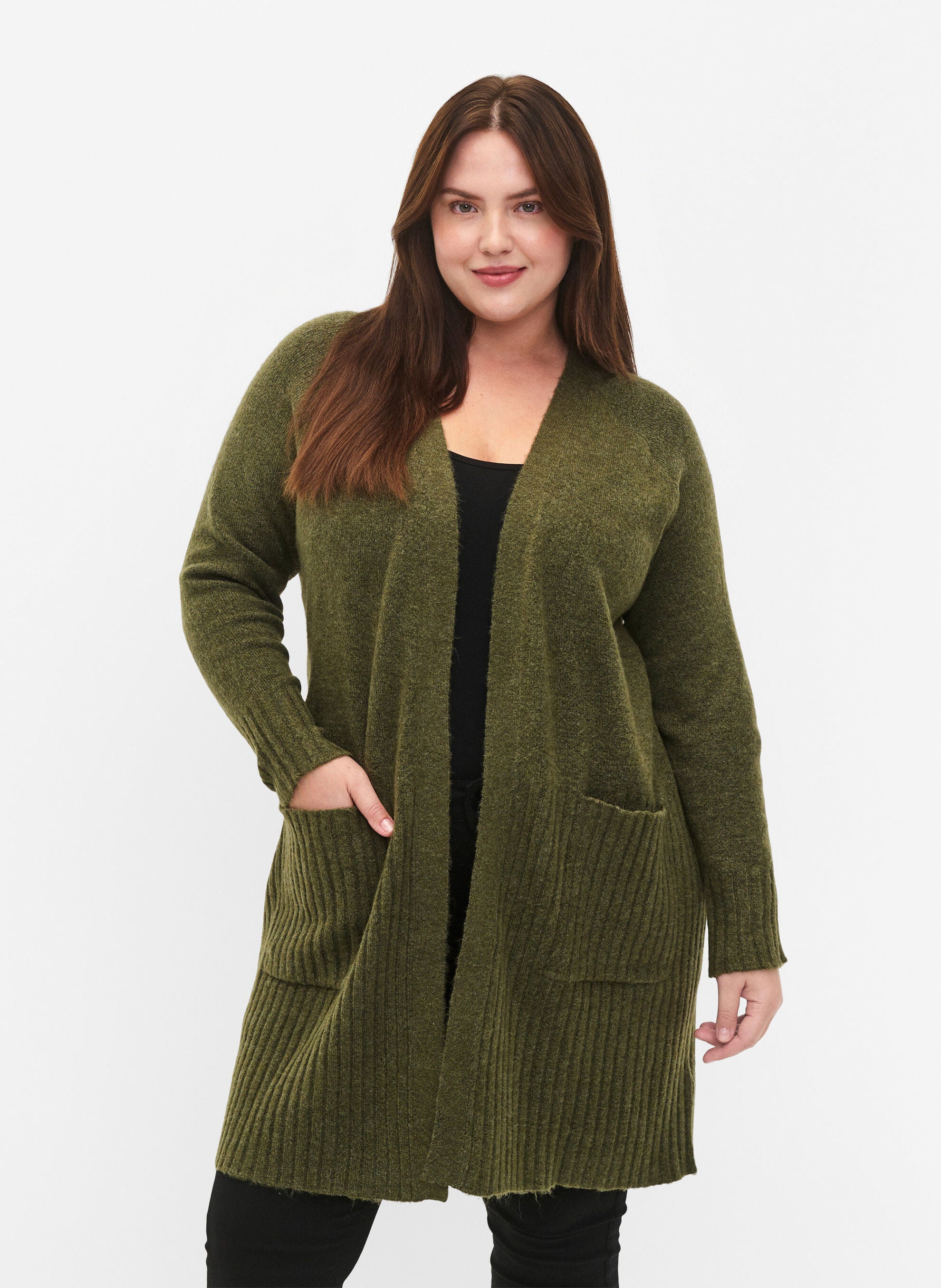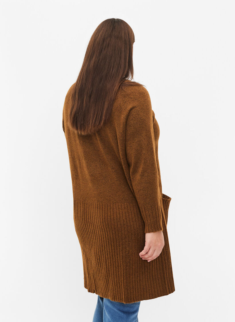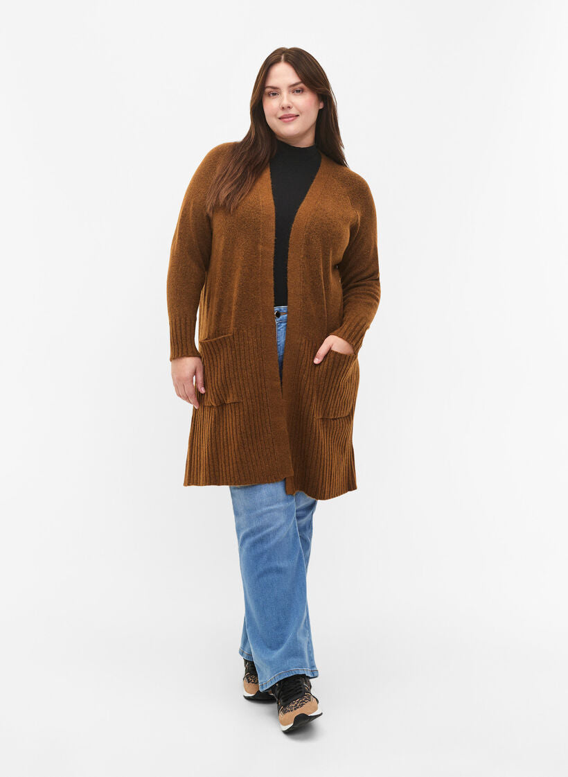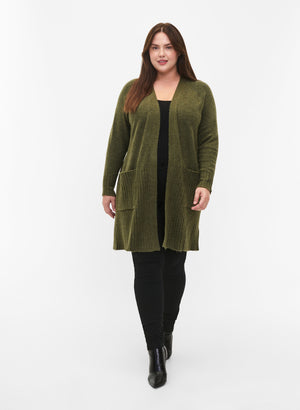Síðar ermar og vasar að framan.