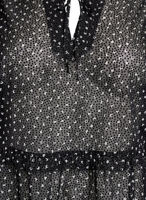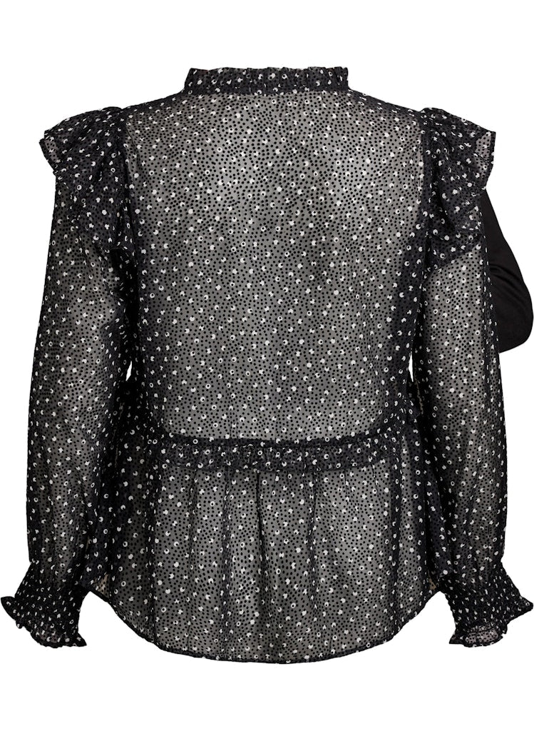 Skyrtan er hálf gegnsæ með smáu velúr mynstri og því mælt með að vera í svörtum hlýrabol innanundir.