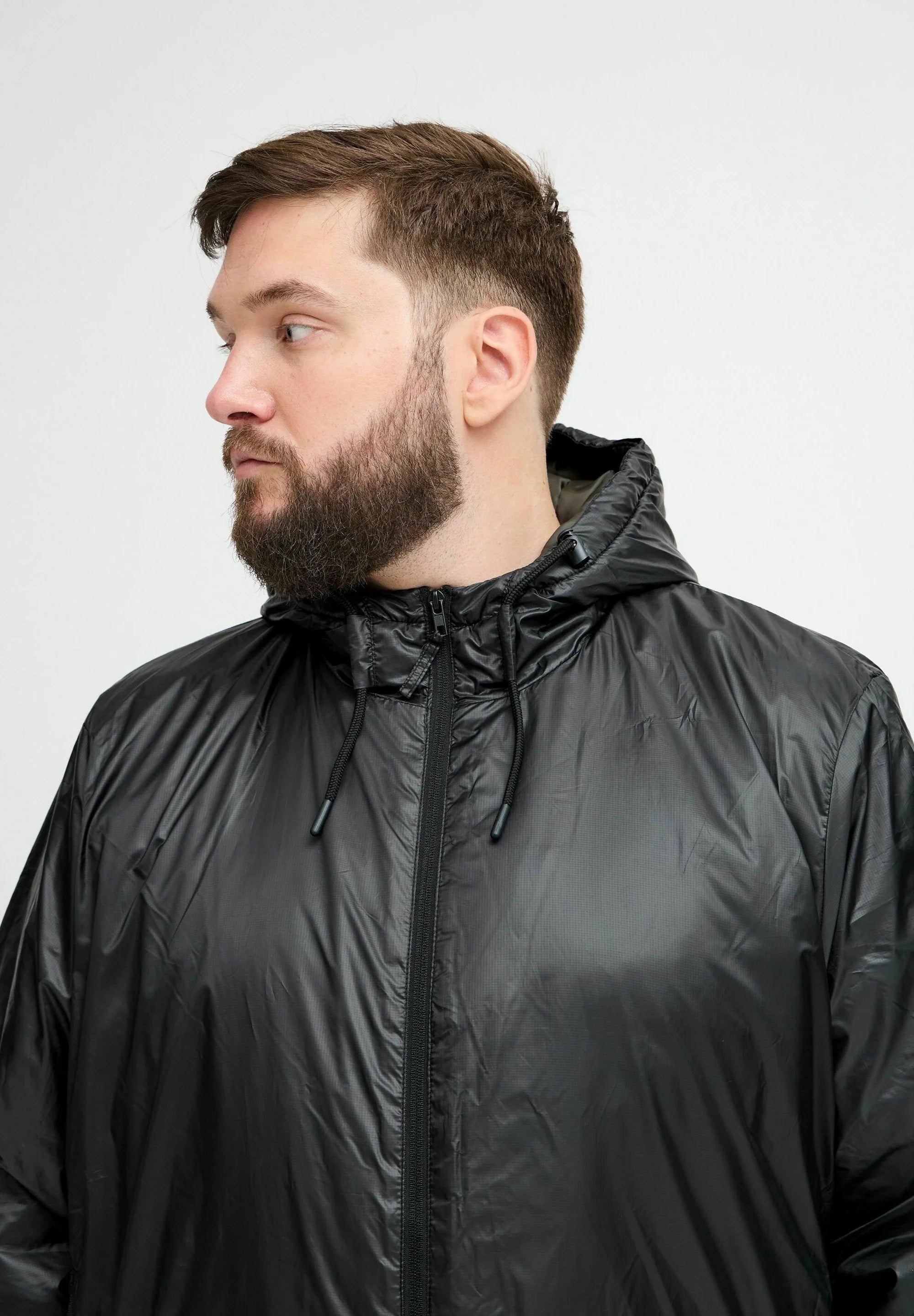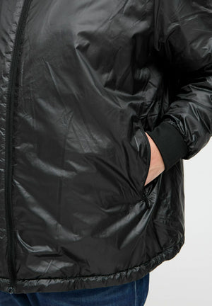 Úlpan er lokuð með rennilás og áfastri hettu.