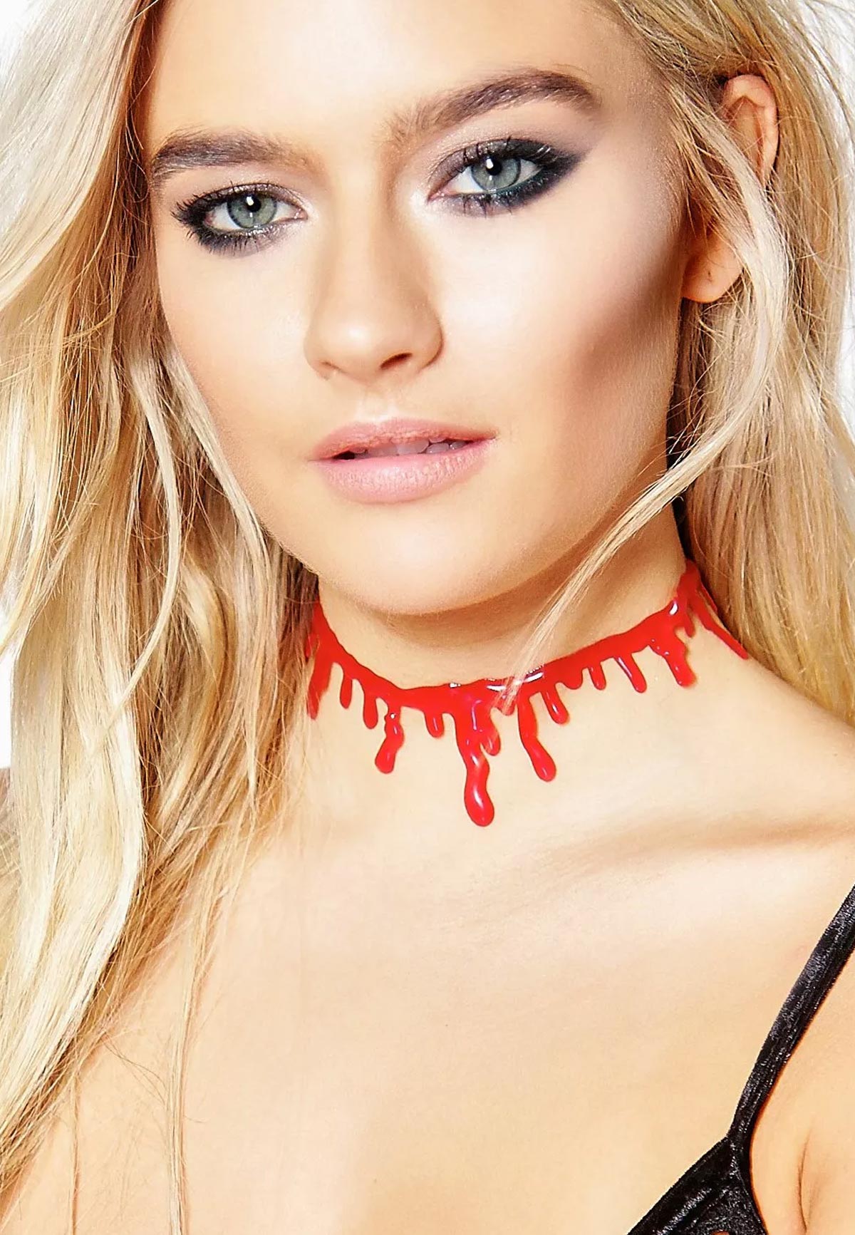 Blóðdropa-choker hálsmen fyrir hrekkjavökuna! Flott við hina ýmsu búninga á hrekkjavöku, til dæmis uppvakninga, Marie Antoinette eða jafnvel hauslausa hænu!