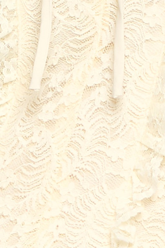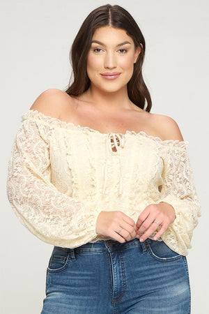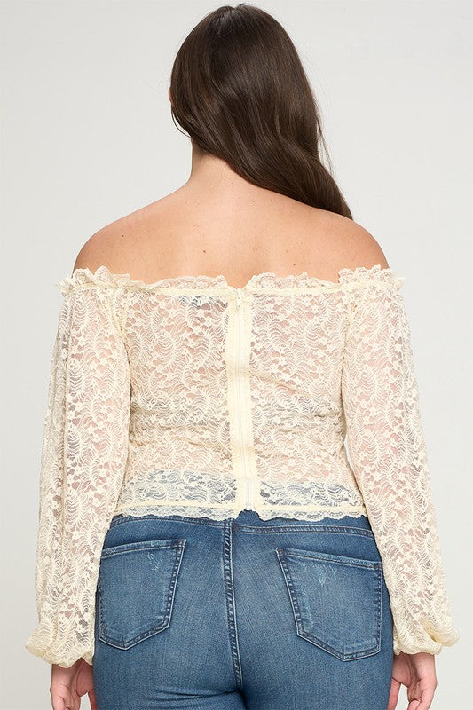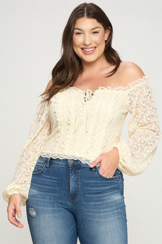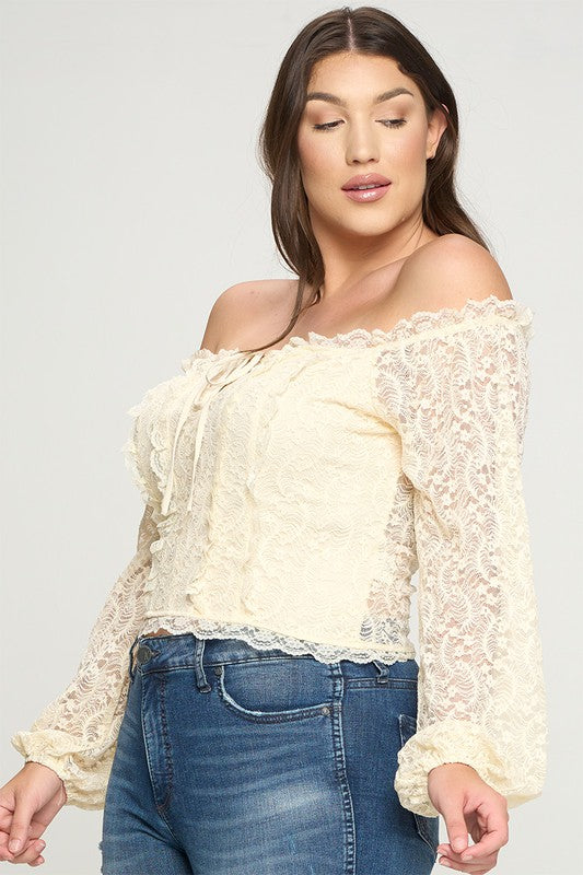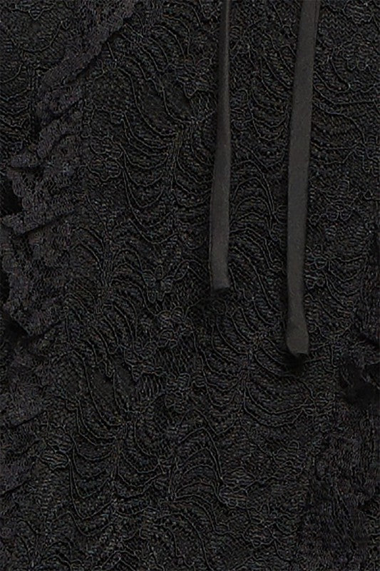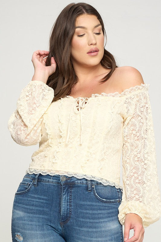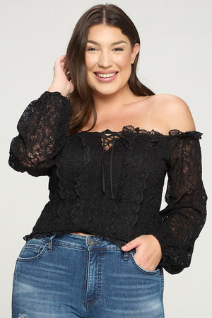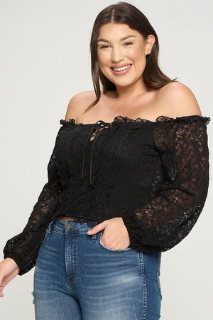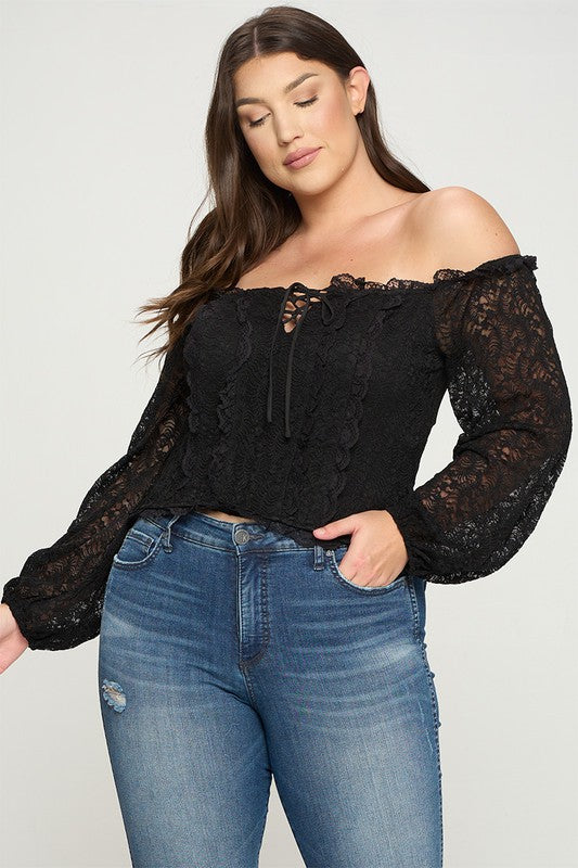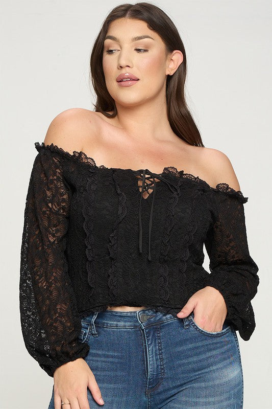 Geggjaður blúndu off shoulder toppur með reimum við hálsmálið og blúndur að framan sem minnir á corselette.