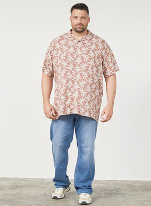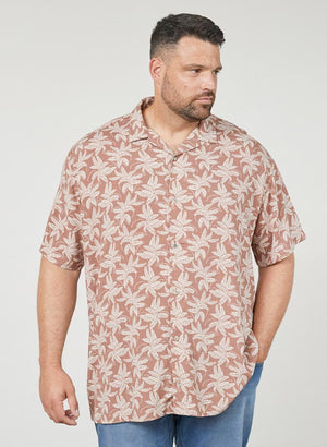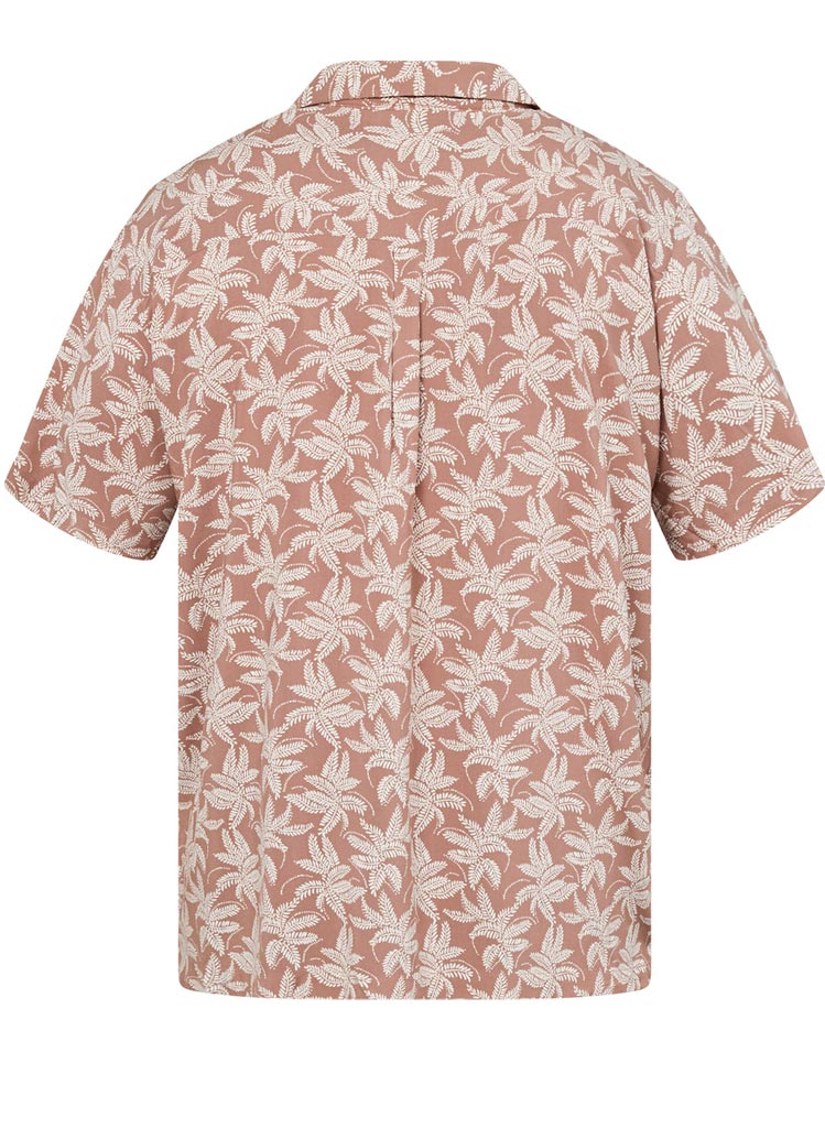 Skyrtan er dökk í grunninn með pálmatrjám.