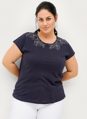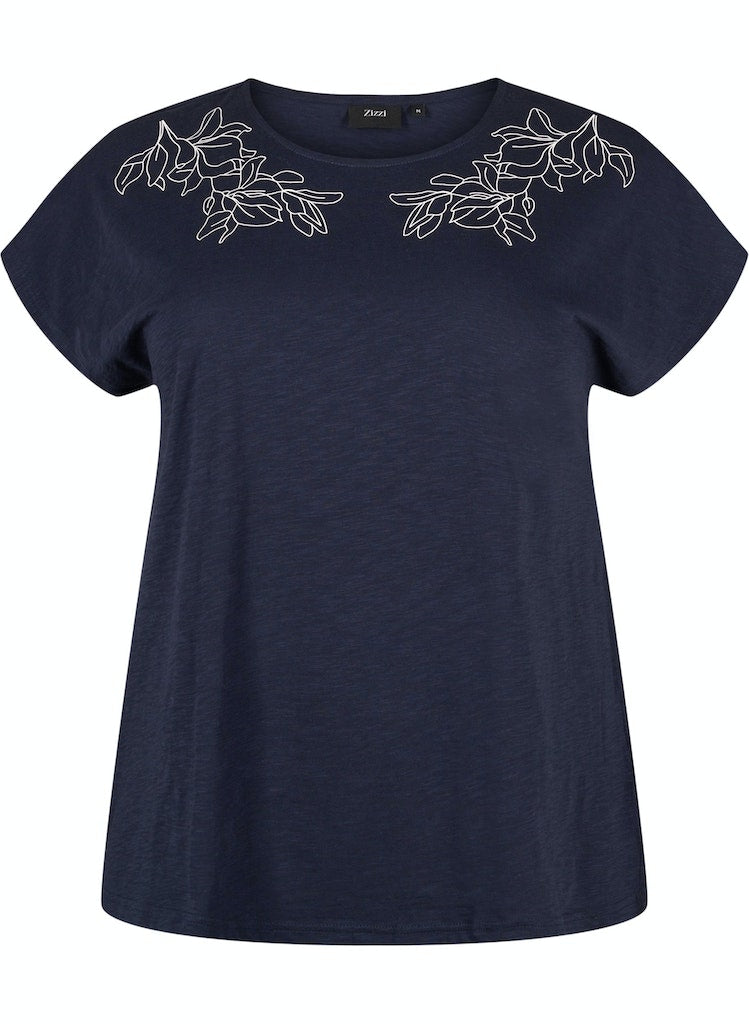 Dökkblár stuttermabolur frá Zizzi með hvítu blómamynstri við hálsmálið.