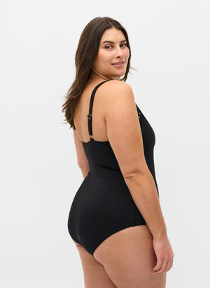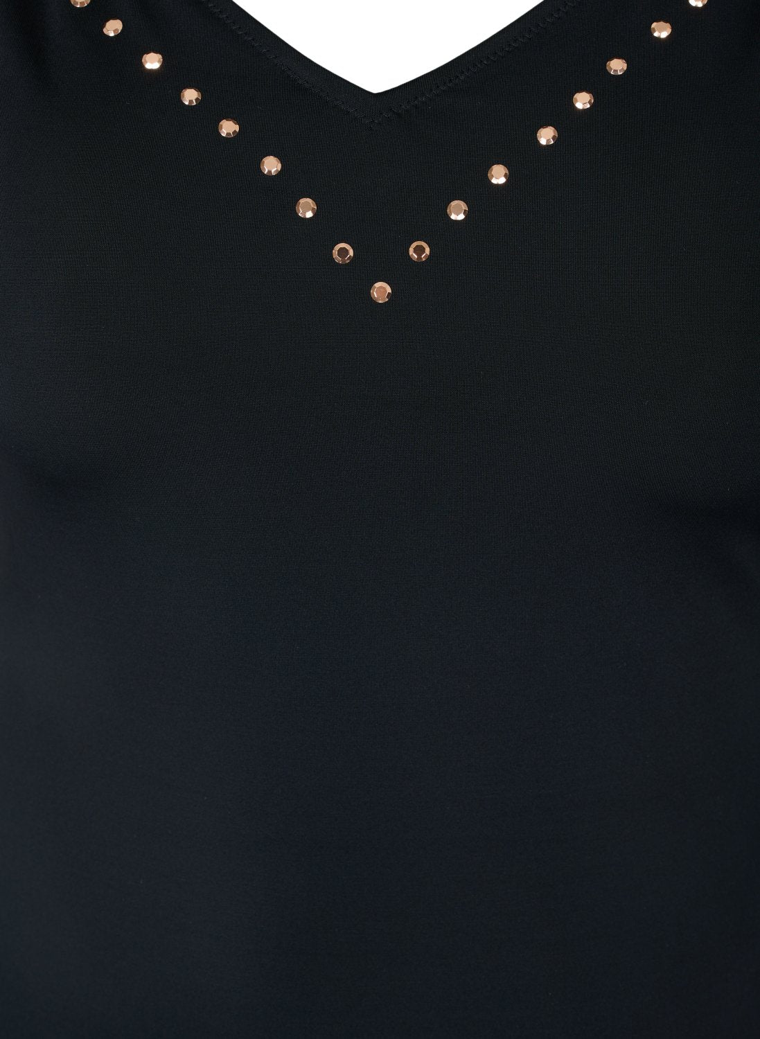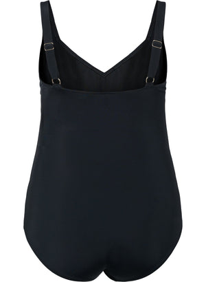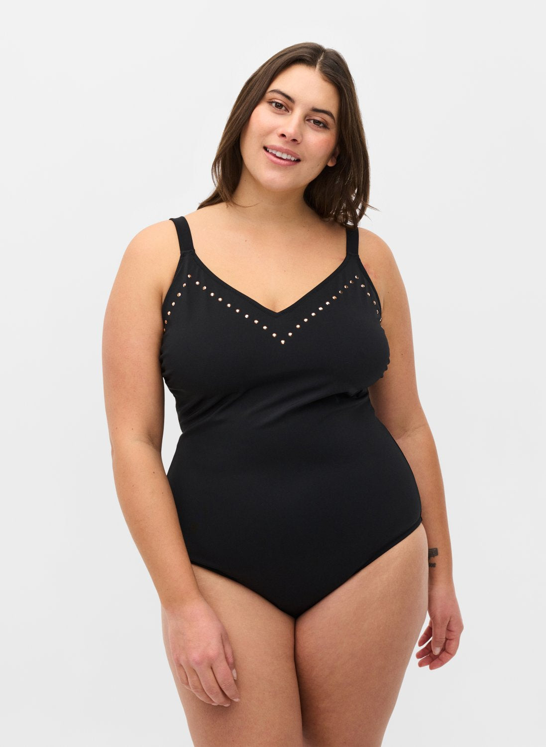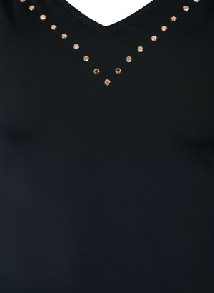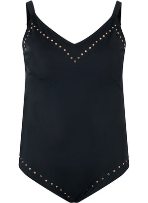 Klassískur sundbolur með V-hálsmáli og skrautsteinum.