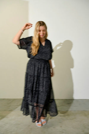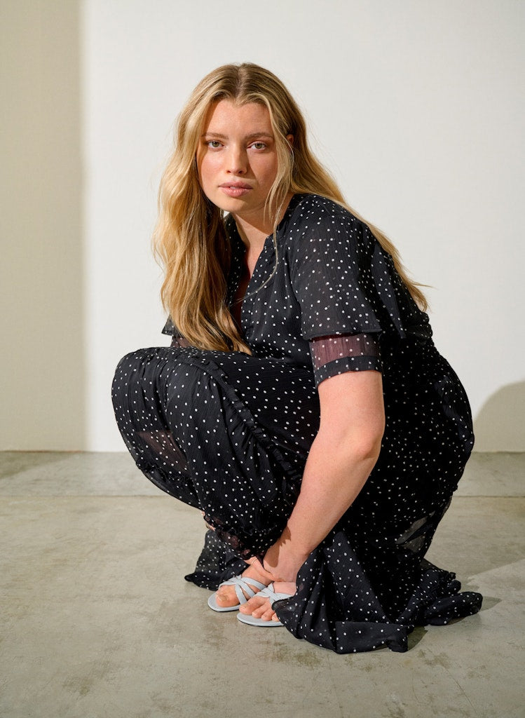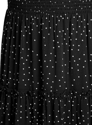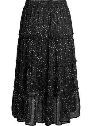 Laust vítt lagskipt pils, létt siffon efni svart í grunninn með hvítum doppum.