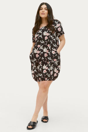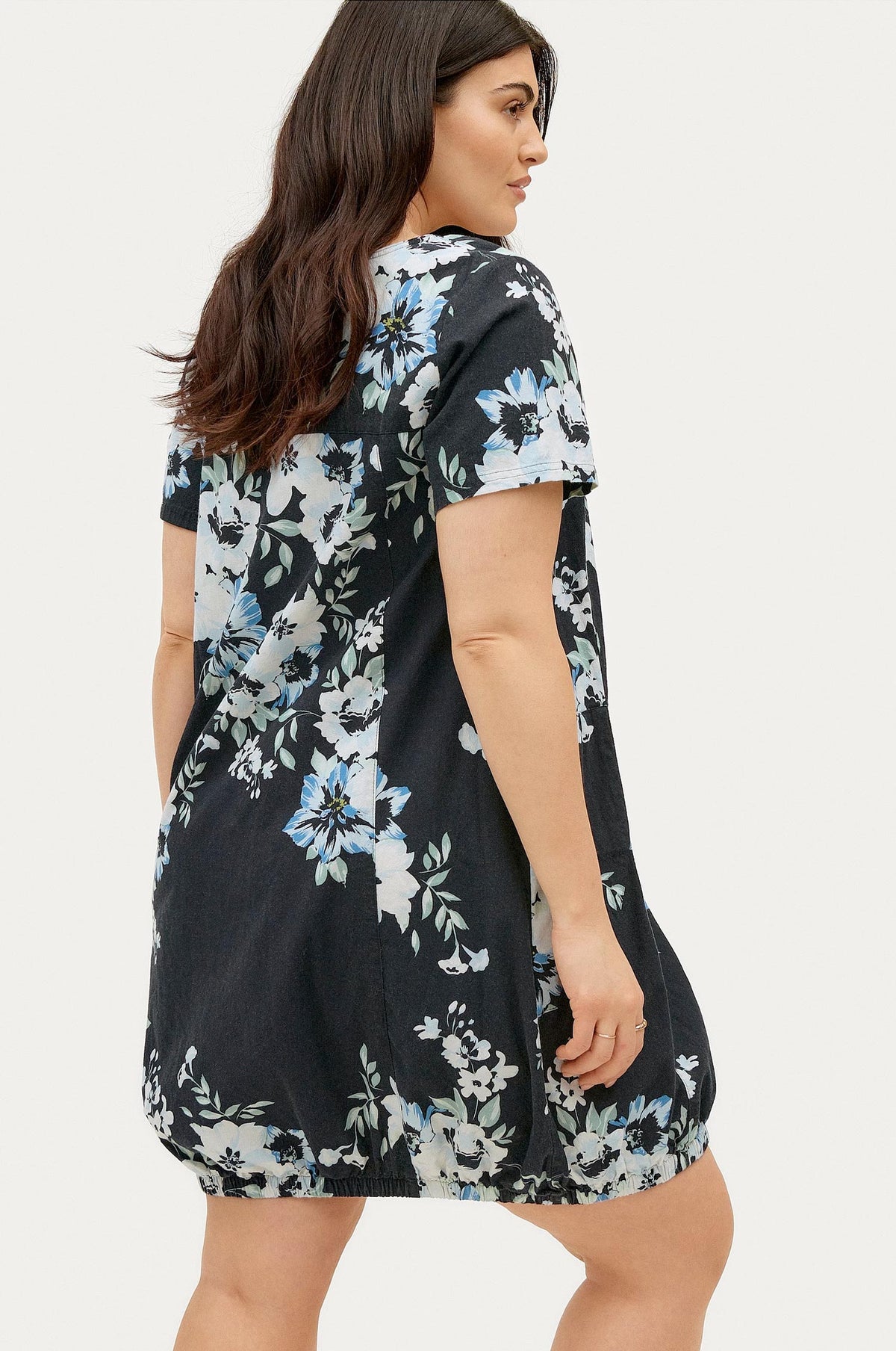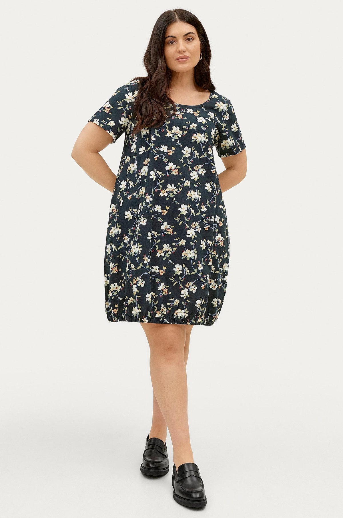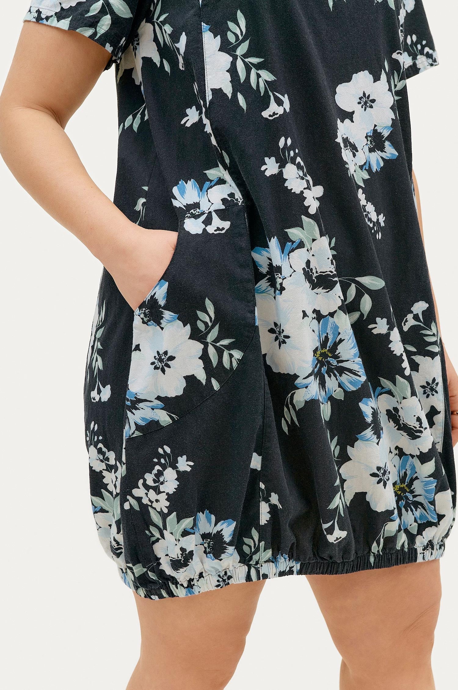 Bómullarkjóll með stuttum ermum, laus teygja neðst niðri og vasar að framan.