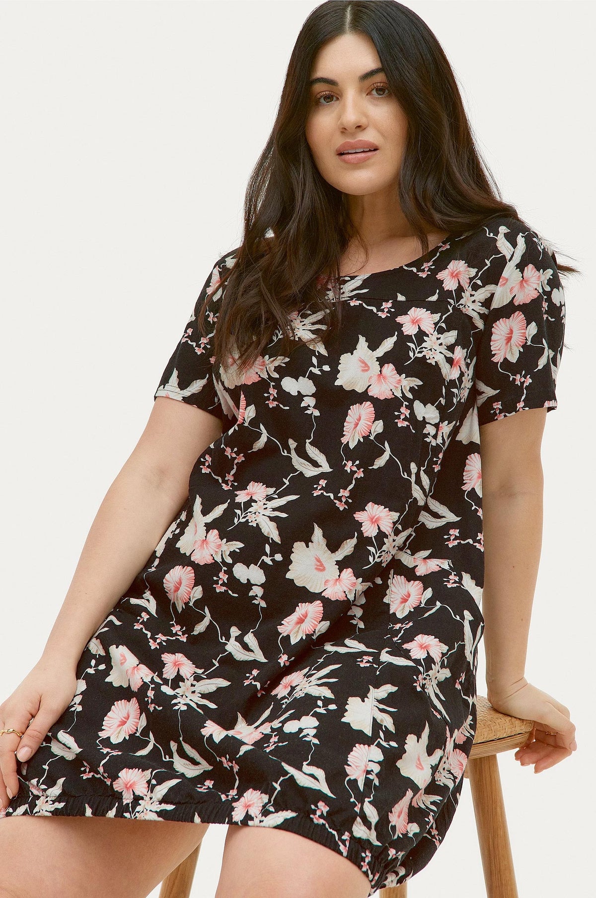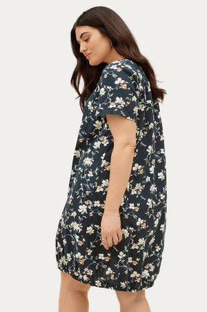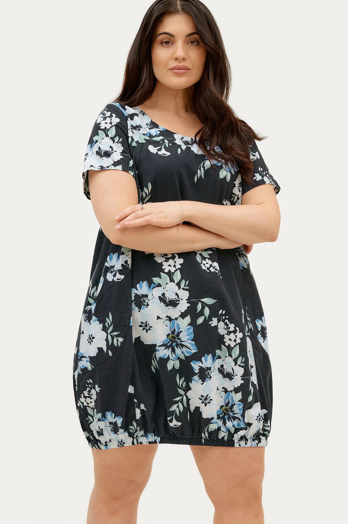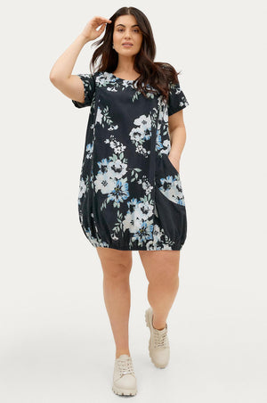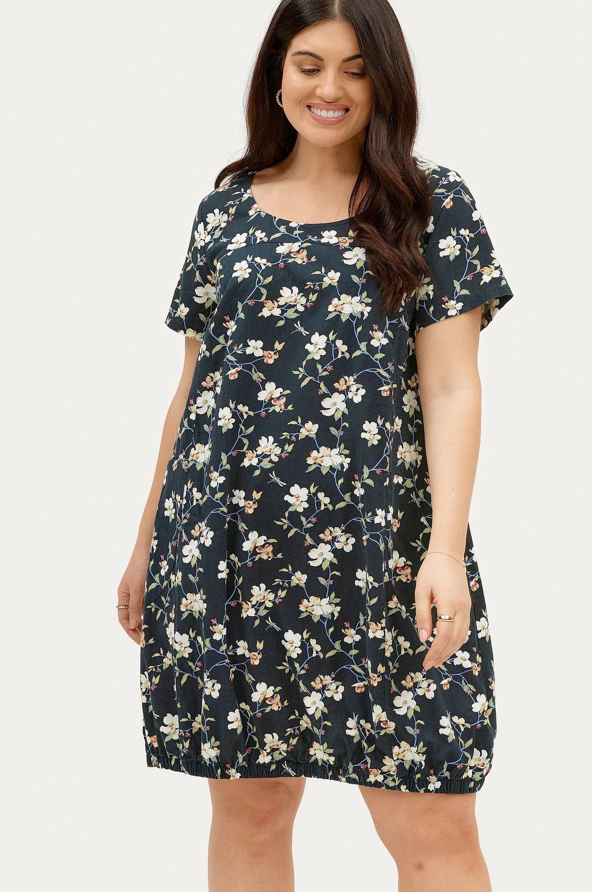 Bómullarkjóll með stuttum ermum, laus teygja neðst niðri og vasar að framan.