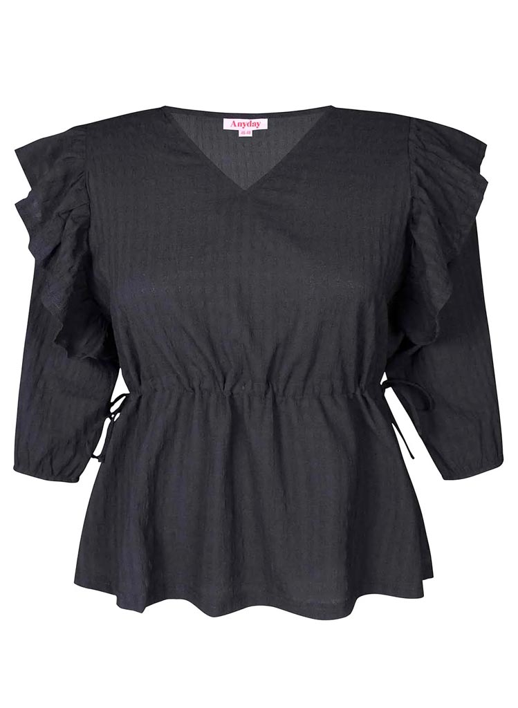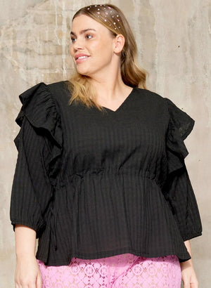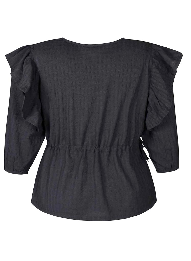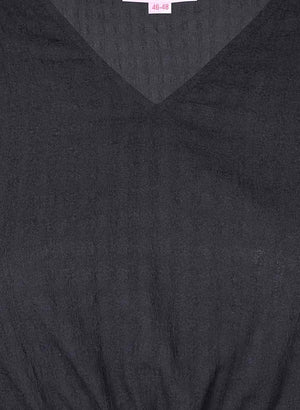 Skyrtan er með V-hálsmáli og hægt að rykkja hana saman inní mittið eftir þörfum.