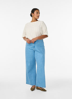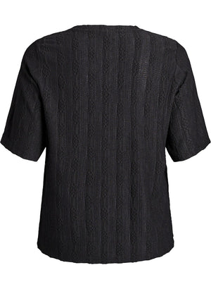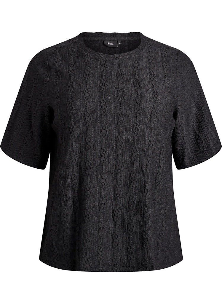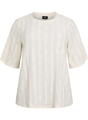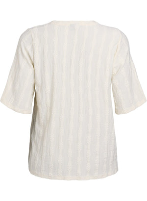 Toppurinn er með rúnnuðu hálsmáli klassísku aðeins lausu og beinu sniði.