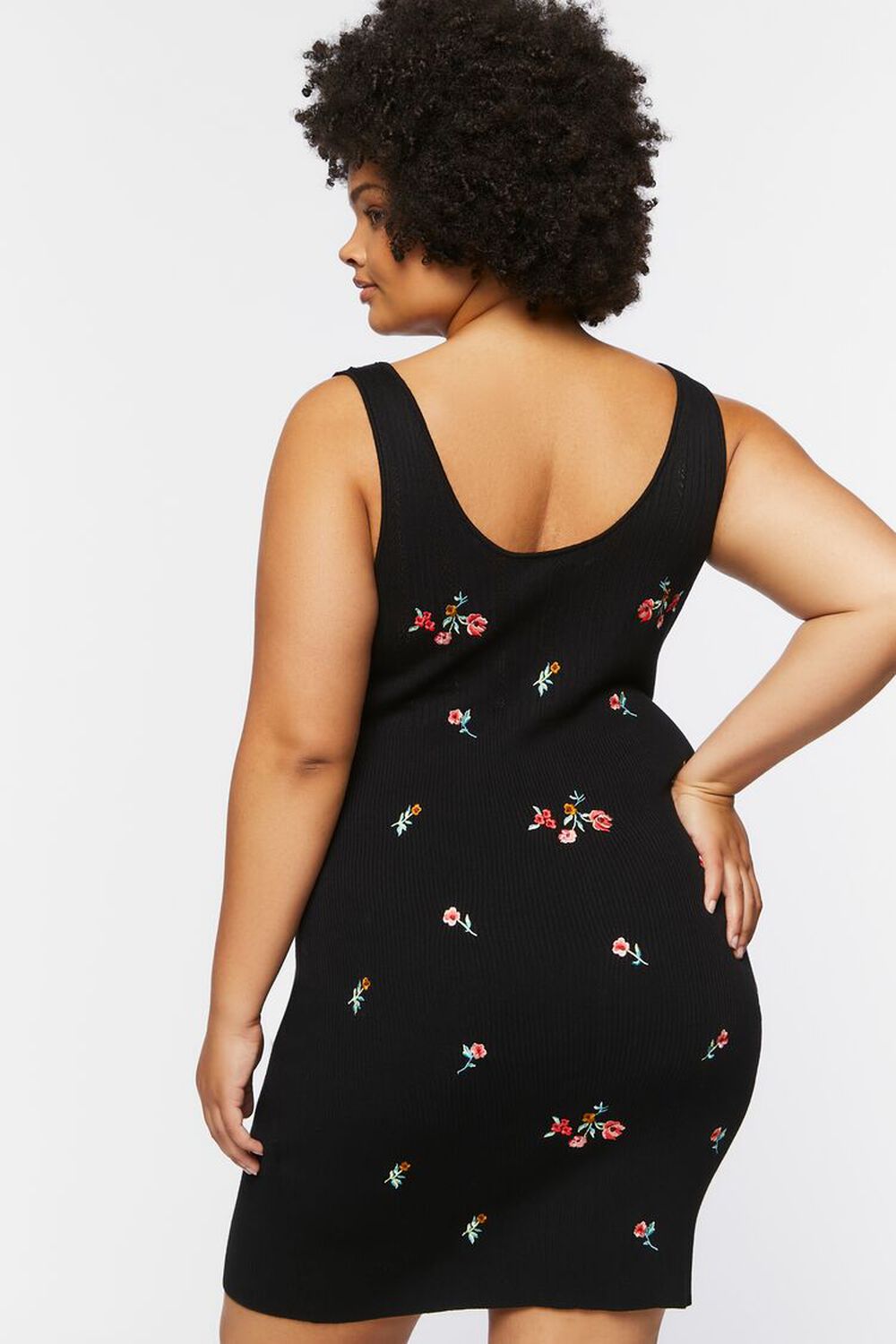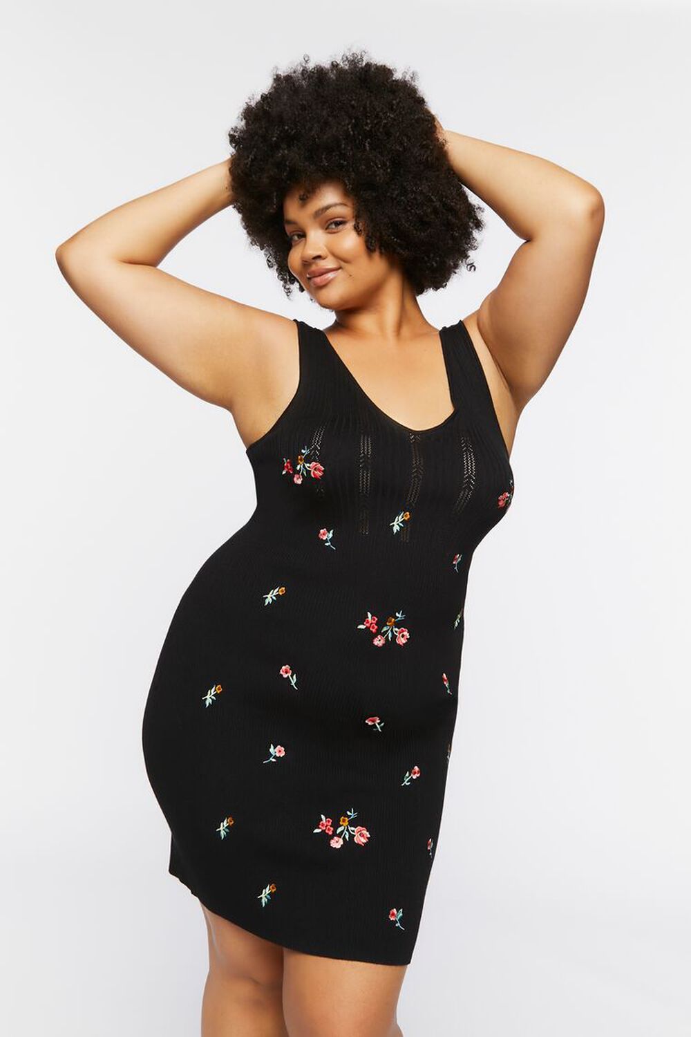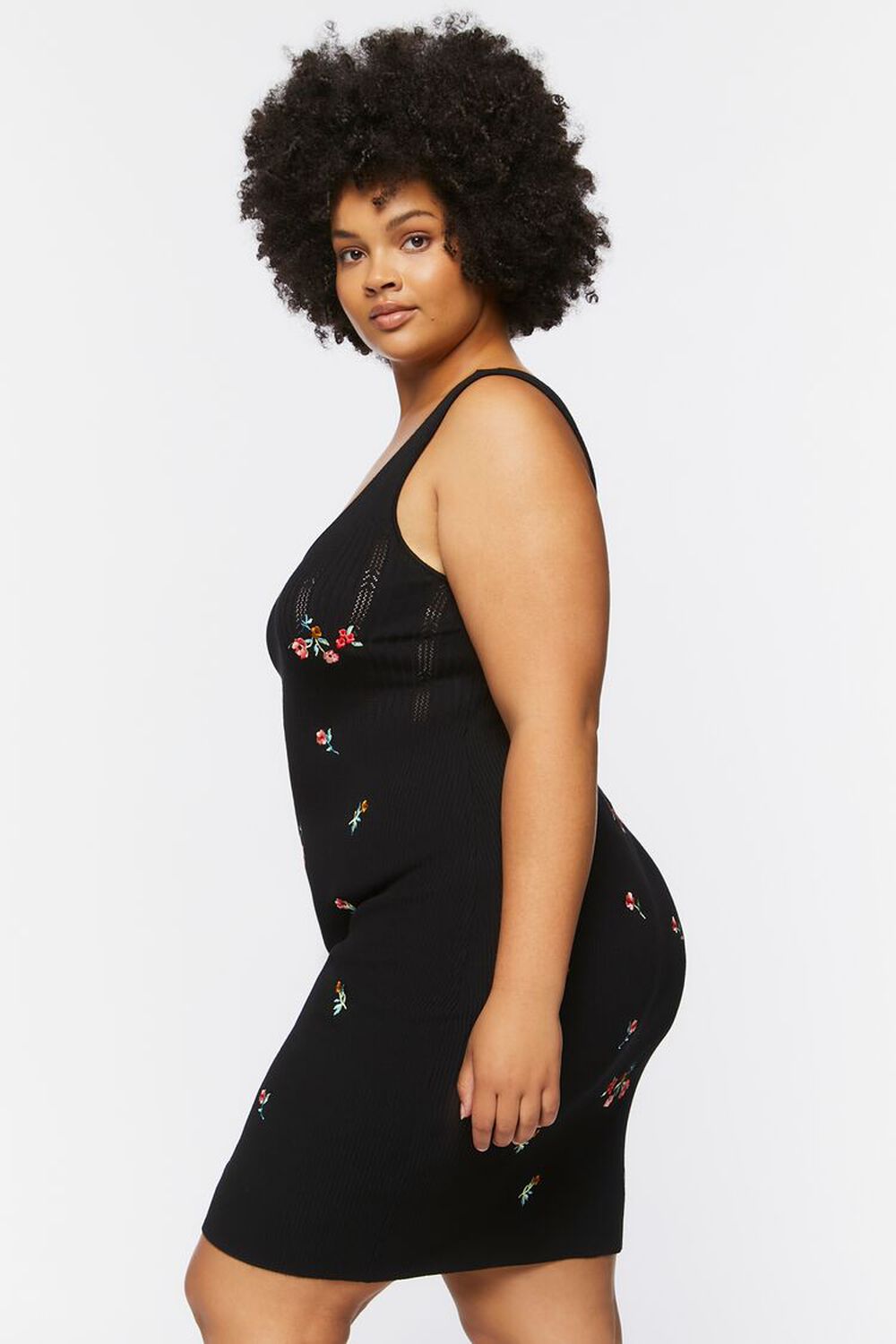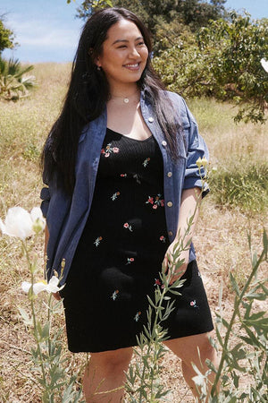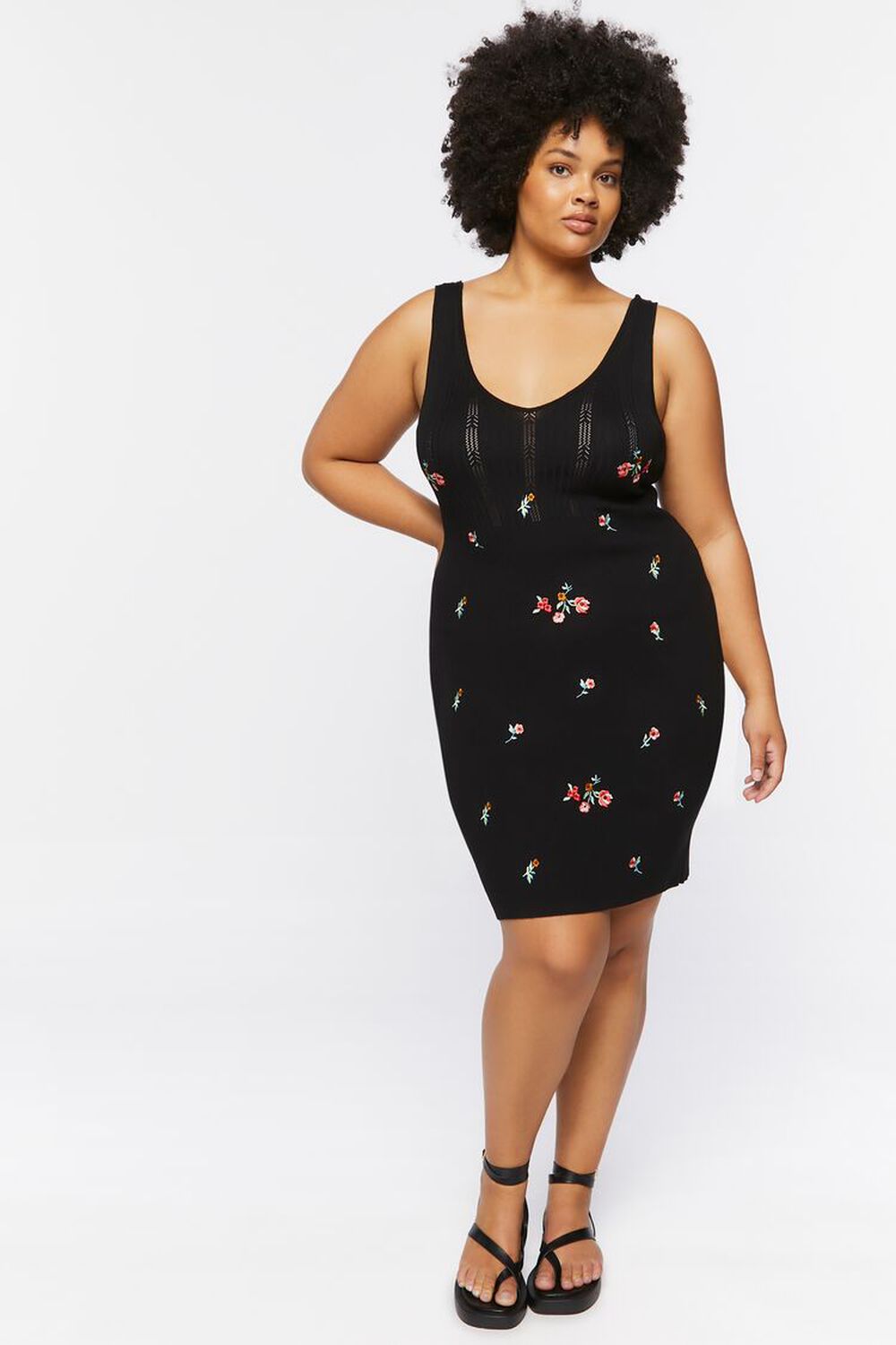 Rúnnað hálsmál, breiðir hlýrar og aðsniðinn. Svart prjónaefni í grunninn með blómamynstri.