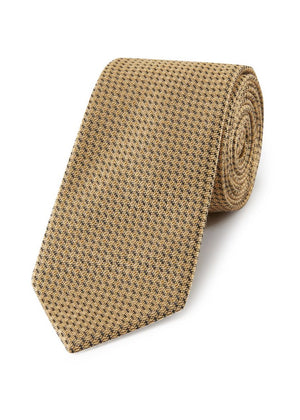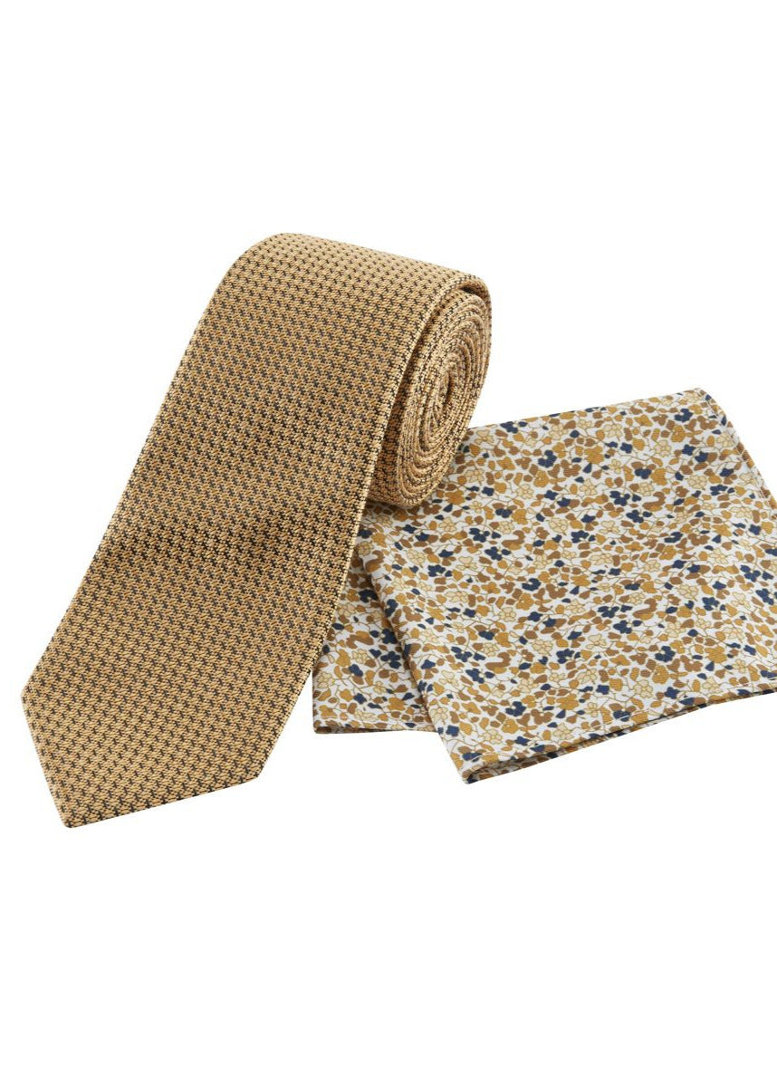 Sinneps gult og gyllt mynstrað bindi og klútur frá lúxusmerkinu Skopes.
