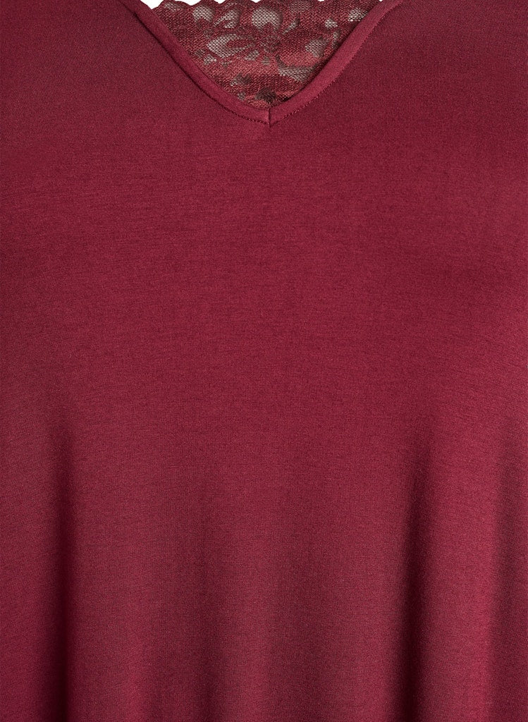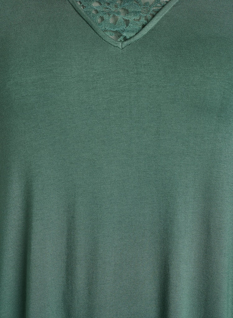 Rúnnað hálsmál , stuttar ermar og blúnda yfir öxlunum.