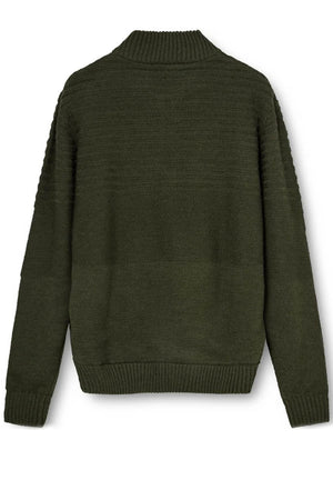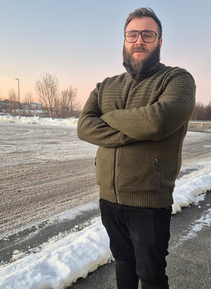 Annarsvegar er það grófprjónuð blanda af 50% acryl og 50% ull að utan og að innan er jakkapeysan fóðruð með svokölluðu " Windstopper " efni svo að peysan skýlir þér frá köldum vindinu og getur því líka virkað sem jakki.