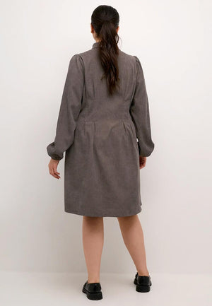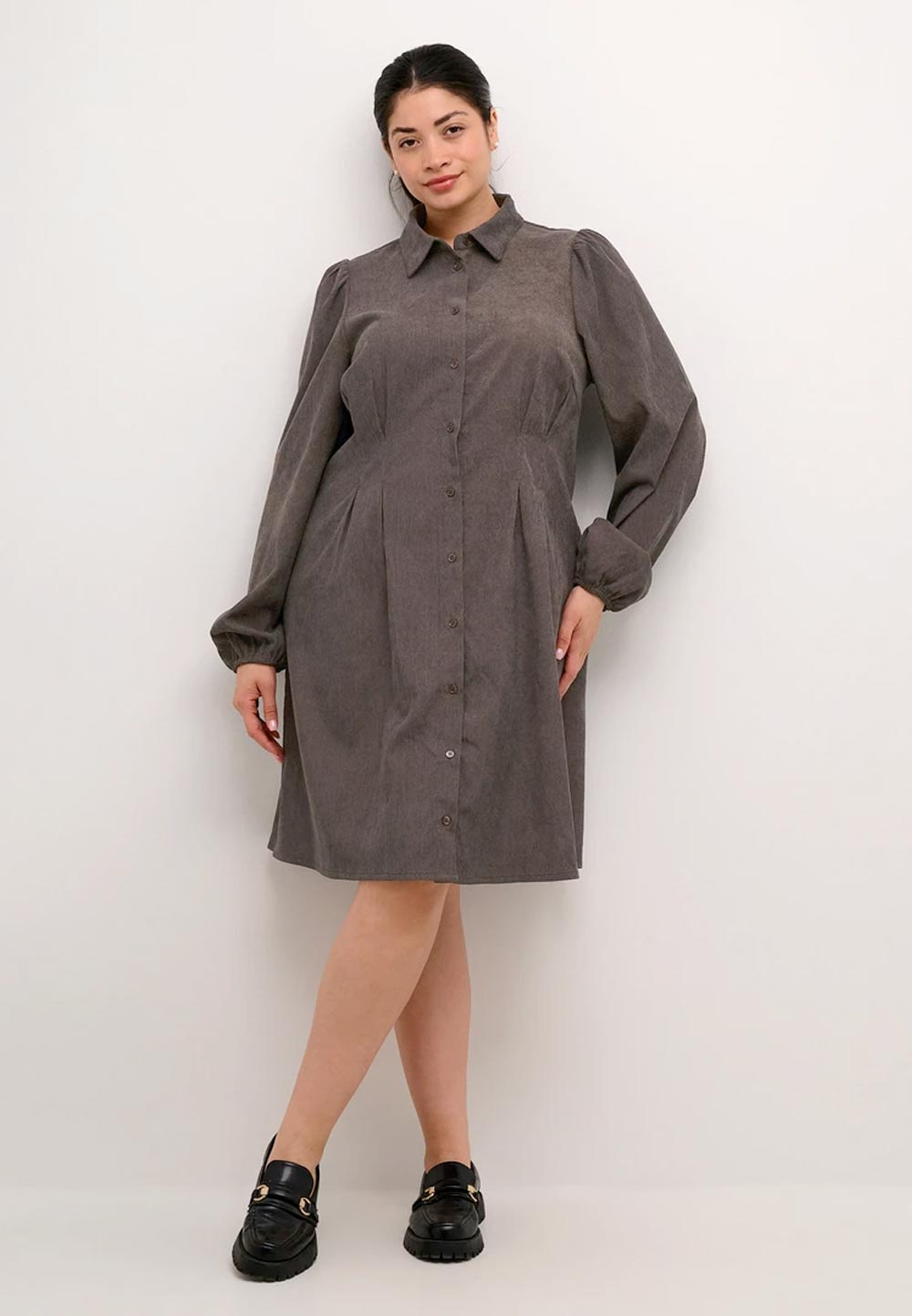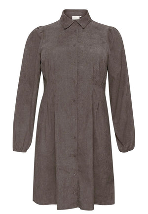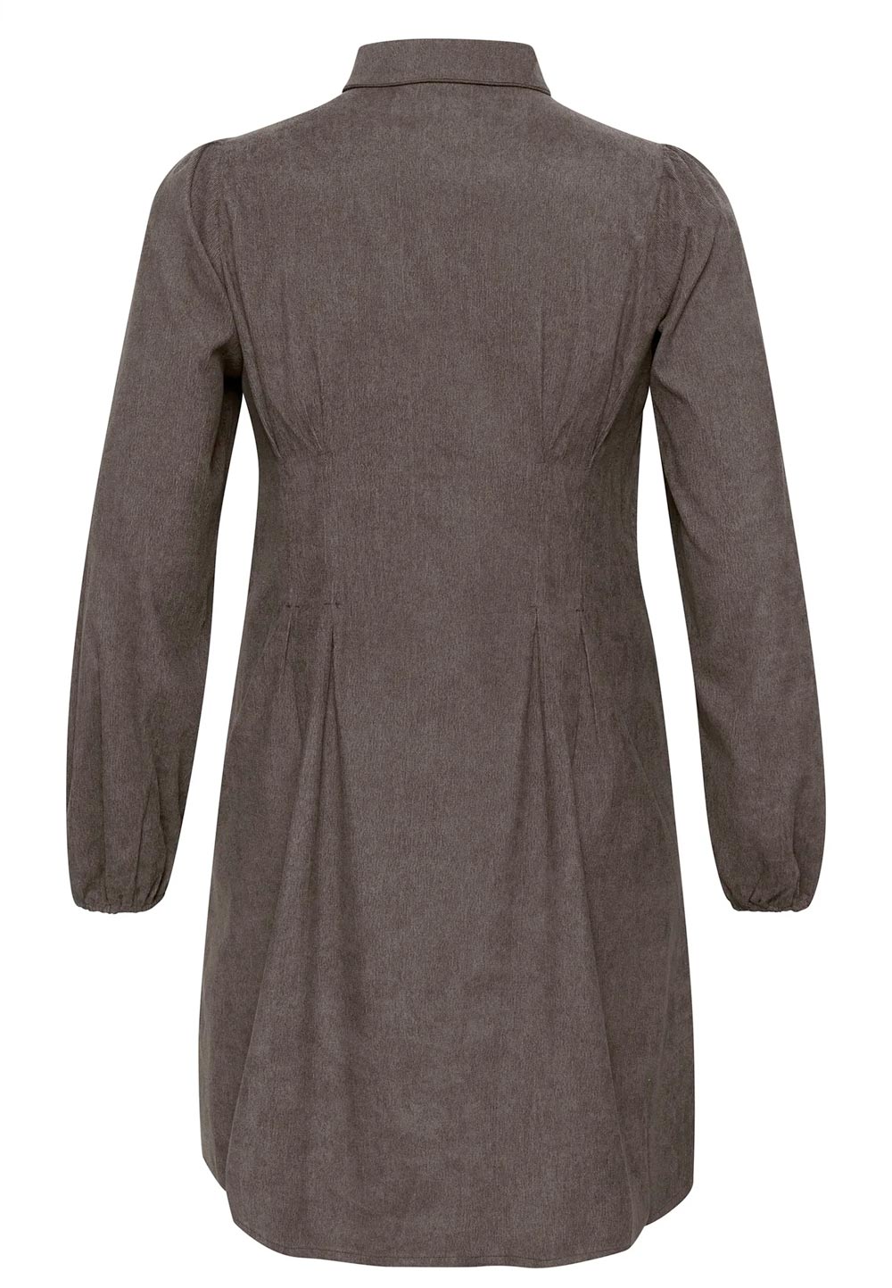 Efnið í skyrtukjólnum er fínlegt rifflað flauelsefni.