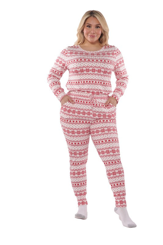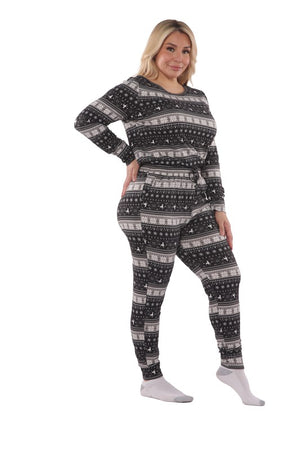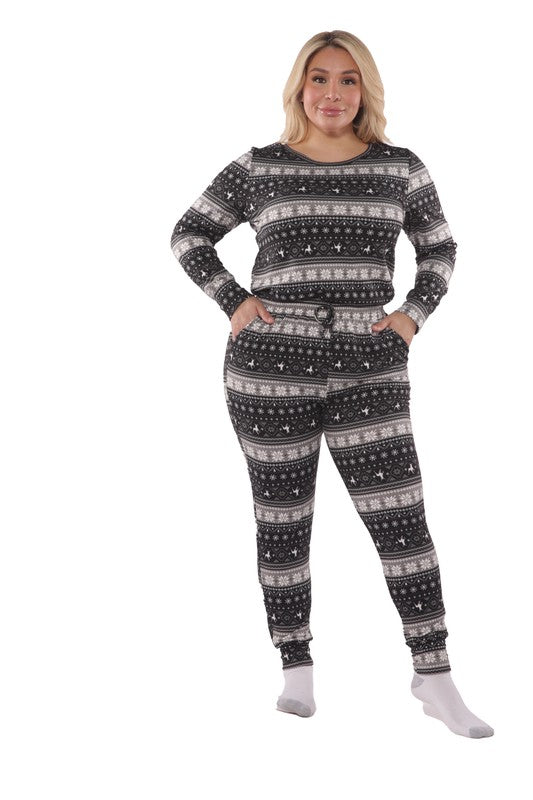 Bolurinn er með rúnnuðu hálsmáli, síðum ermum og klassísku sniði en buxurnar eru með jogger sniði, teygju í mittinu og vösum.