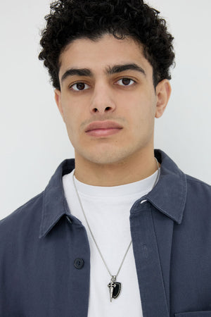 Fínleg og sterk keðja úr riðfríu stáli og nikkel frí. Á keðjunni er svo skjöldur og rítingur.