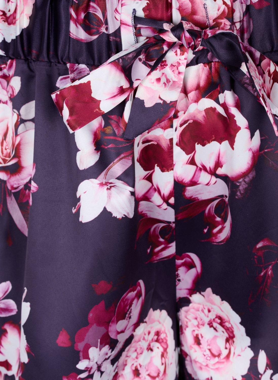 Satín efni fjólublátt í grunninn með bleiku blómamynstri.