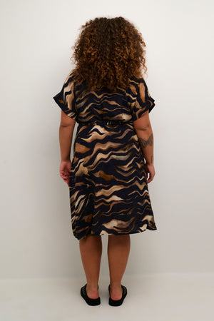 Kjóllinn er í brúntóna mynstri - bundið saman í mittinu