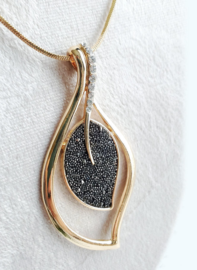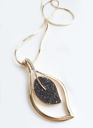 Hálsmen með langri gylltri keðju og skrautmeni með smáum steinum.