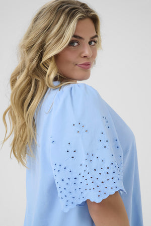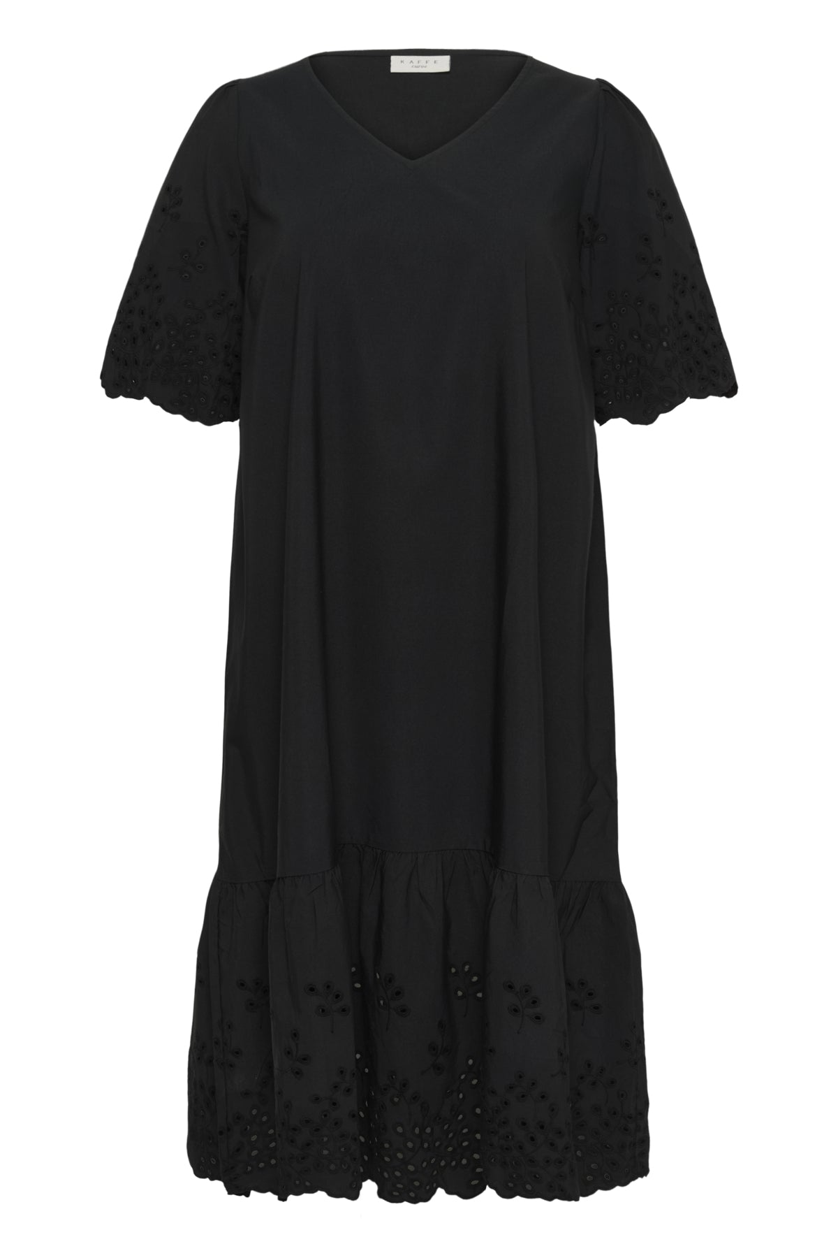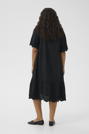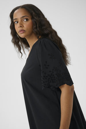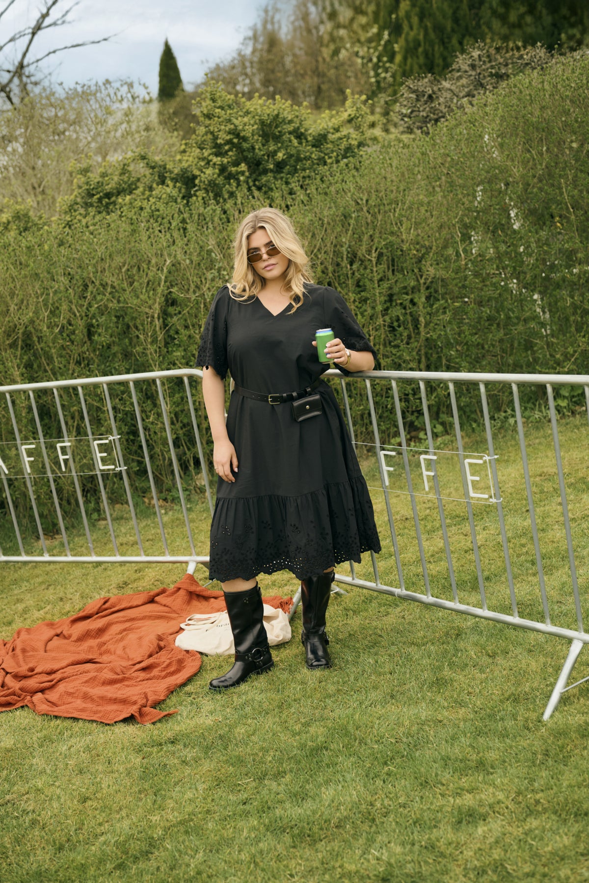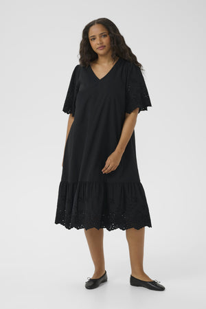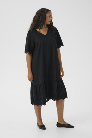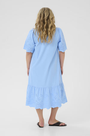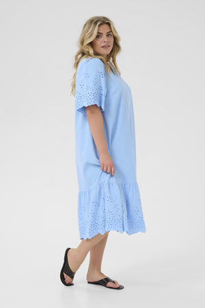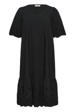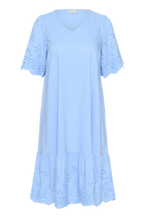 V-hálsmál Broderie Anglese ermar og bekkur neðst á kjólnum