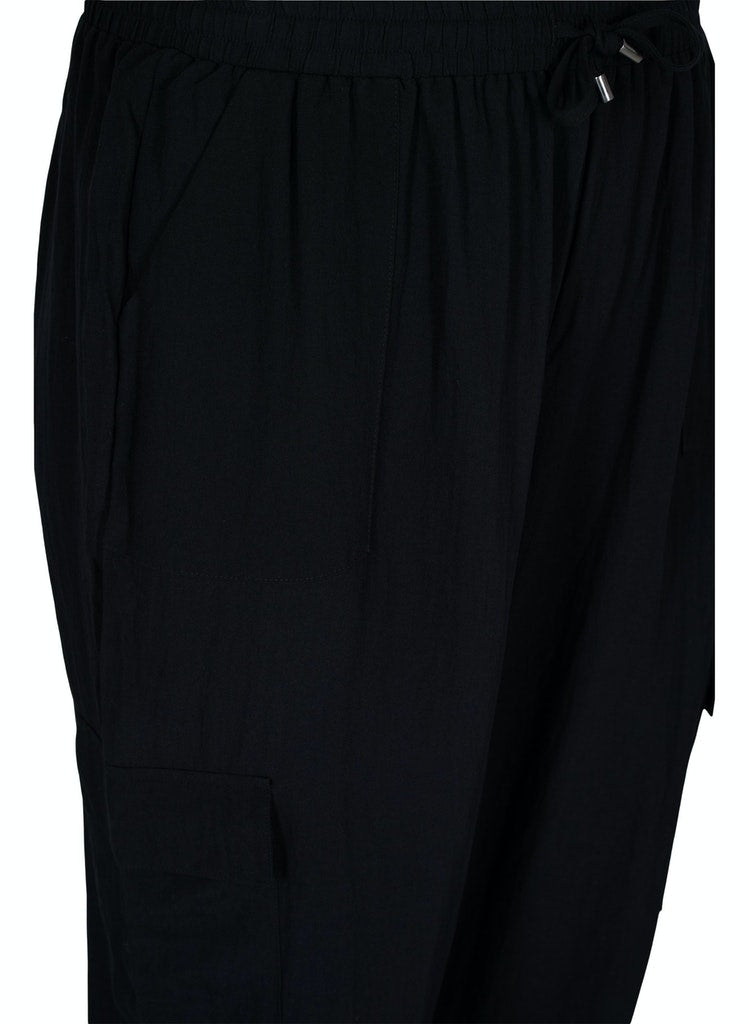 Létt viscose blanda sem gefur ekki mikið eftir en það er góð teygja með stillanlegu bandi í mittinu og létt teygja neðst á skálmum.