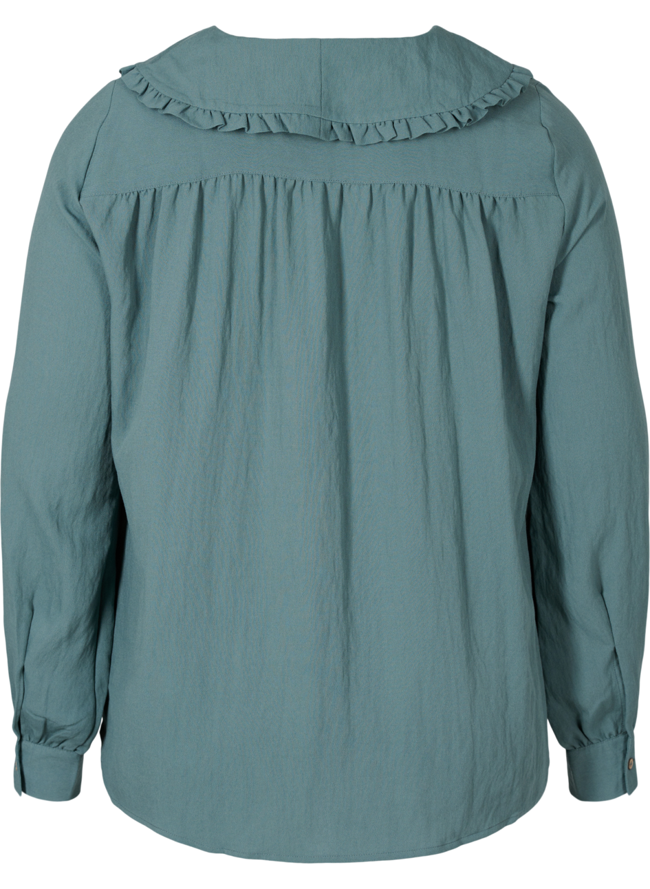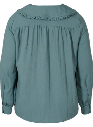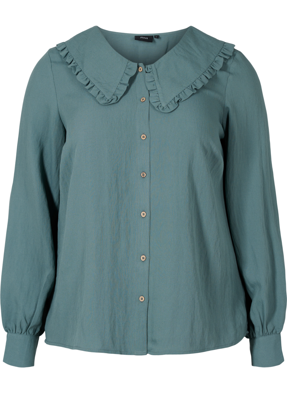 Á skyrtunni er breiður kragi með fínlegum pífukanti.