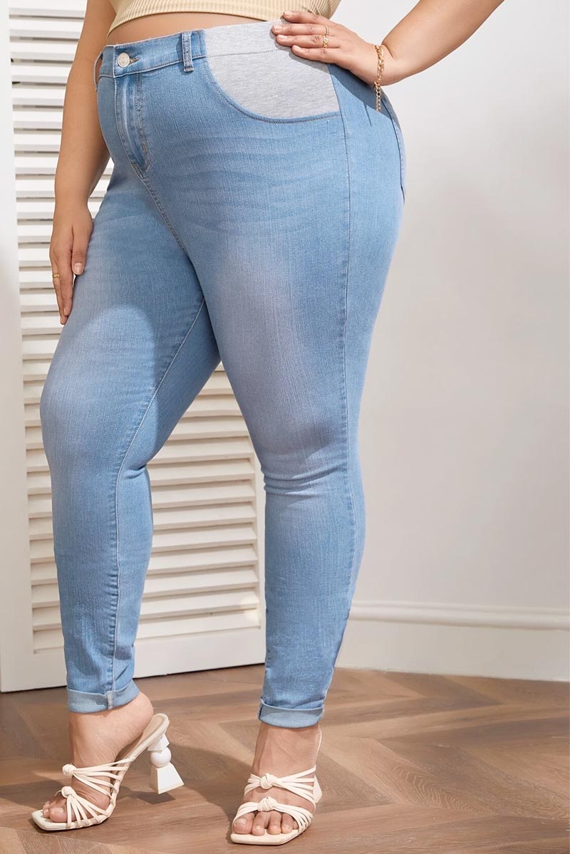 Mjúkar teygjanlegar meðgöngu gallabuxur með extra vídd yfir magasvæðið fyrir stækkandi malla og henta líka mjög vel á síðari hluta meðgöngu.
