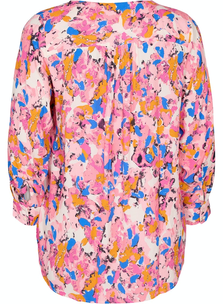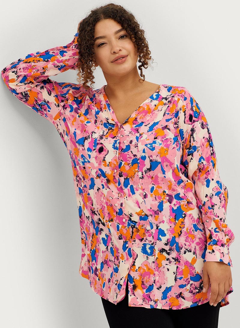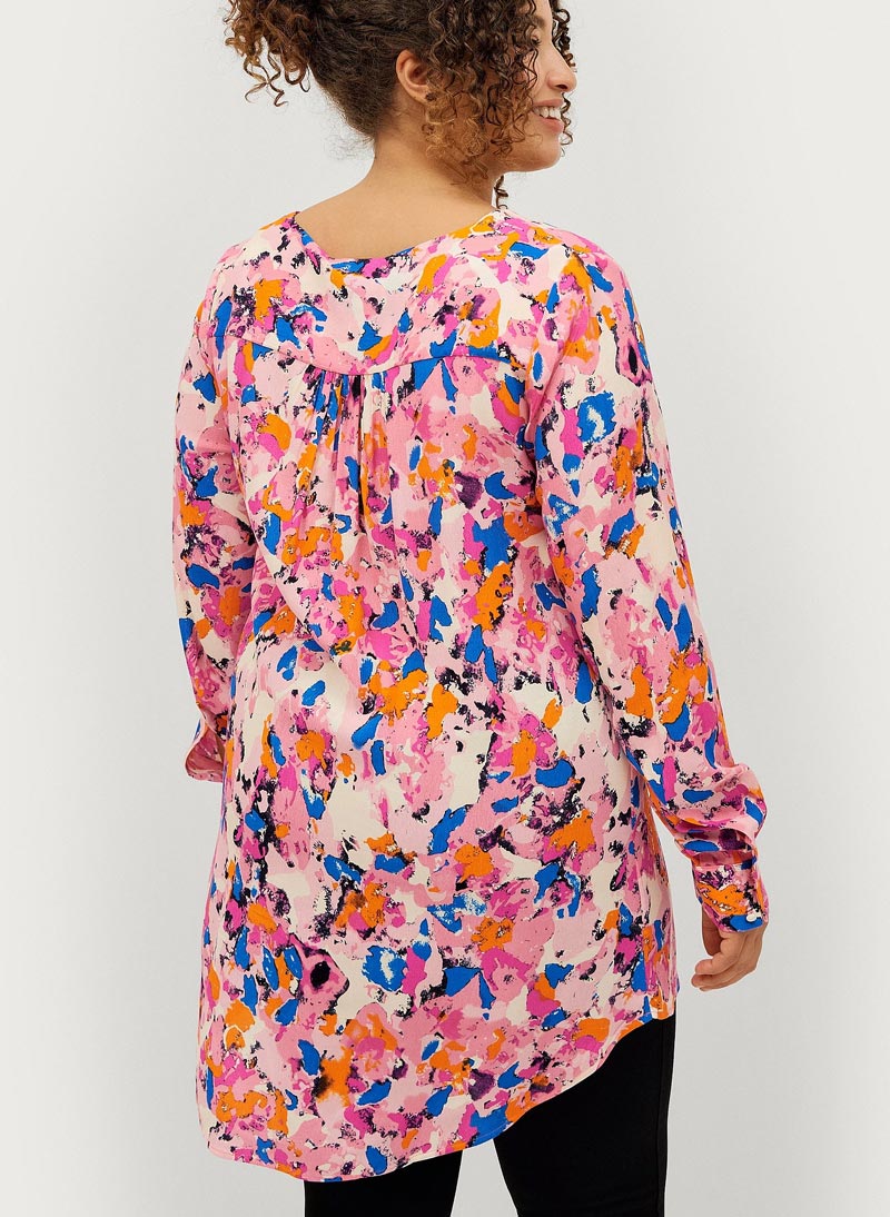 Blússan er hnepptur alla leið að framan og er í lausu klæðilegu A-sniði.