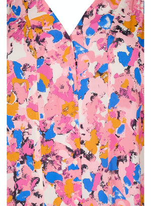 Efnið er bleikt í grunninn með mynstri í björtum litum.