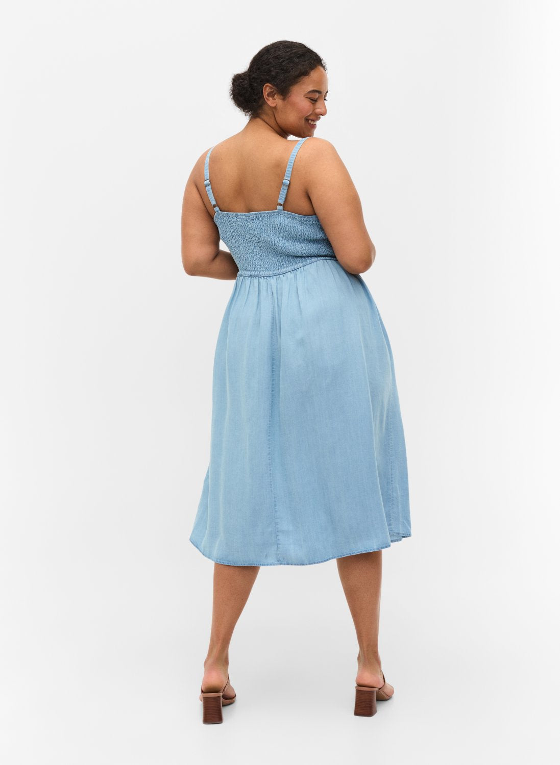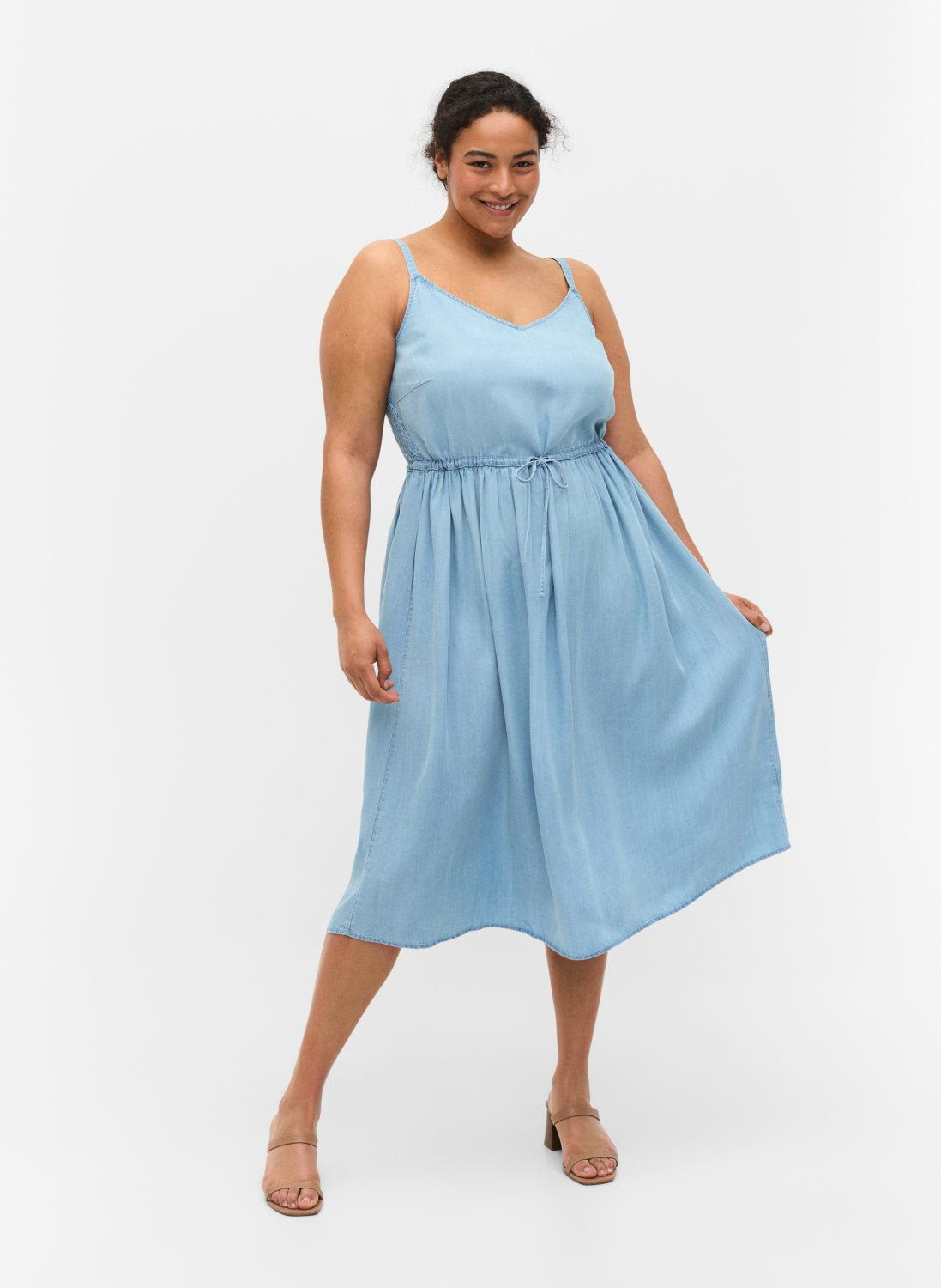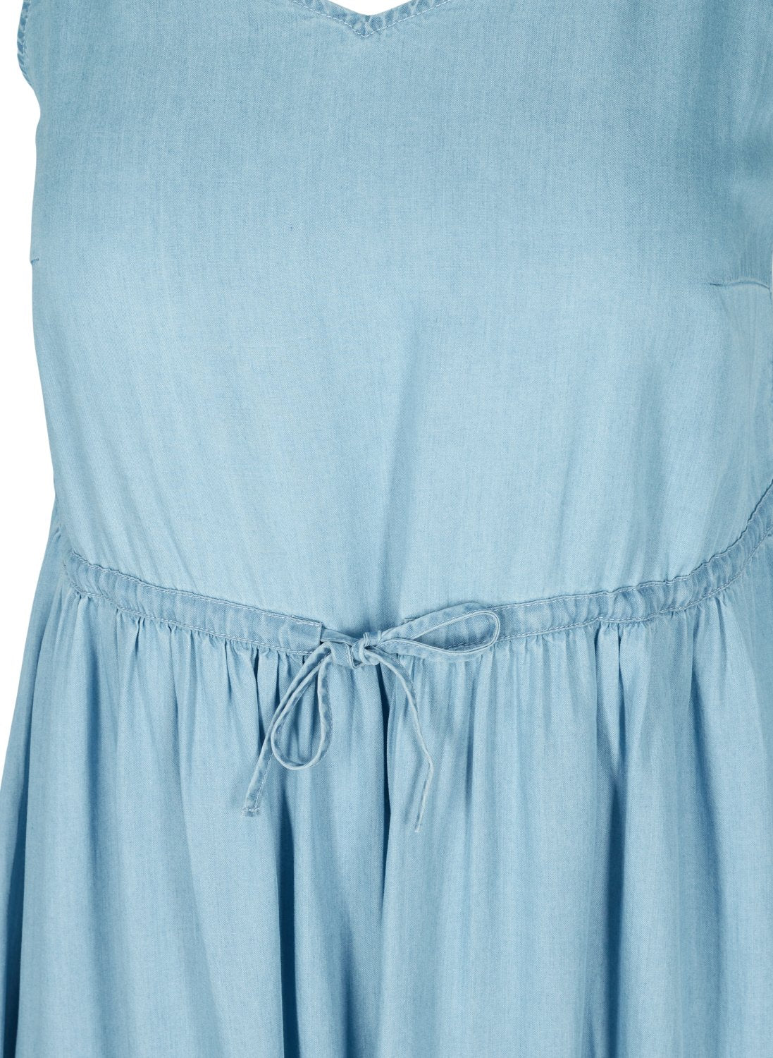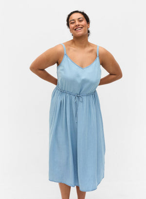 Léttur sumarkjóll ljósblár galla-look kjóll með grönnun stillanlegum hlýrum frá danska merkinu Zizzi.