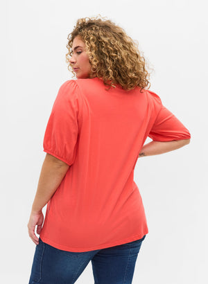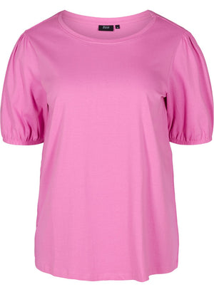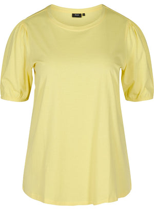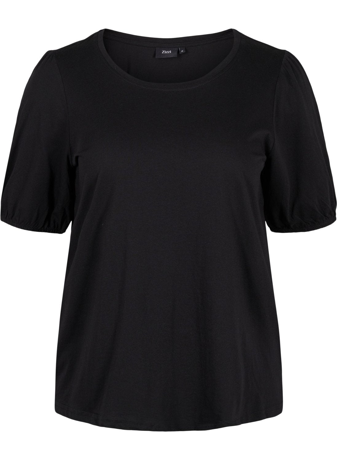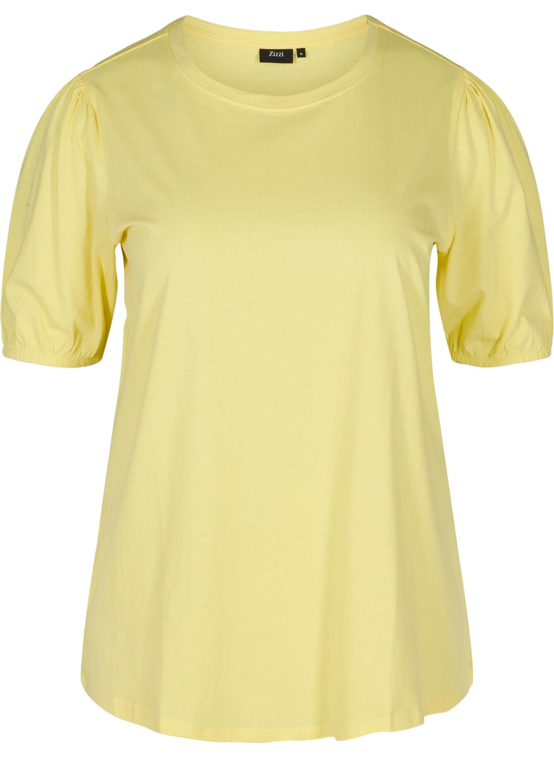 Þægilegur basic stuttermabolur frá Zizzi með rúnuðu hálsmáli og rykktum stuttum ermum.