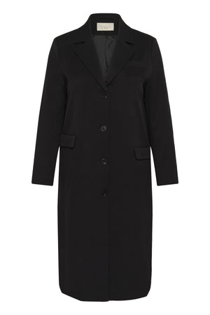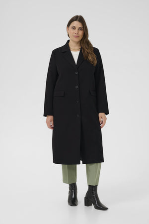 Jakkinn er með aðeins lausu beinu sniði , vasar að framan og lokast með tölum.