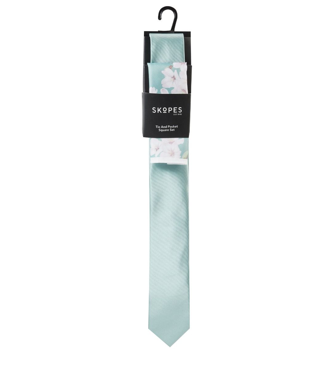 Ljósblátt eða mintulitað bindi og klútur frá lúxusmerkinu Skopes.