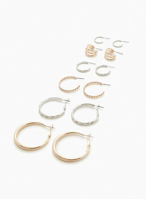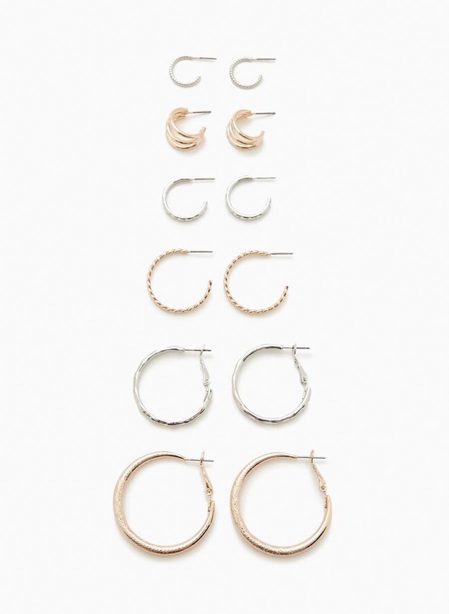 6 pör af skemmtilegum 'hoop' eyrnalokkum. Bæði í gylltu og silfruðu.