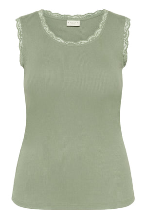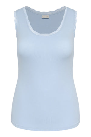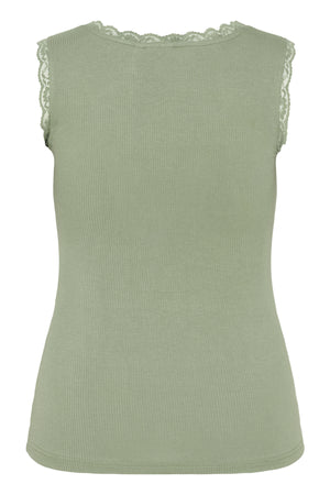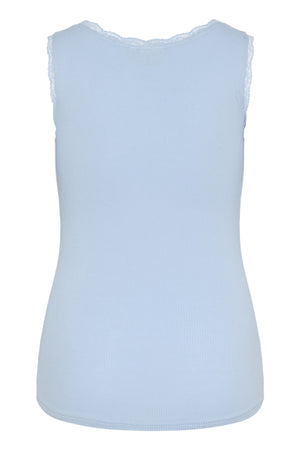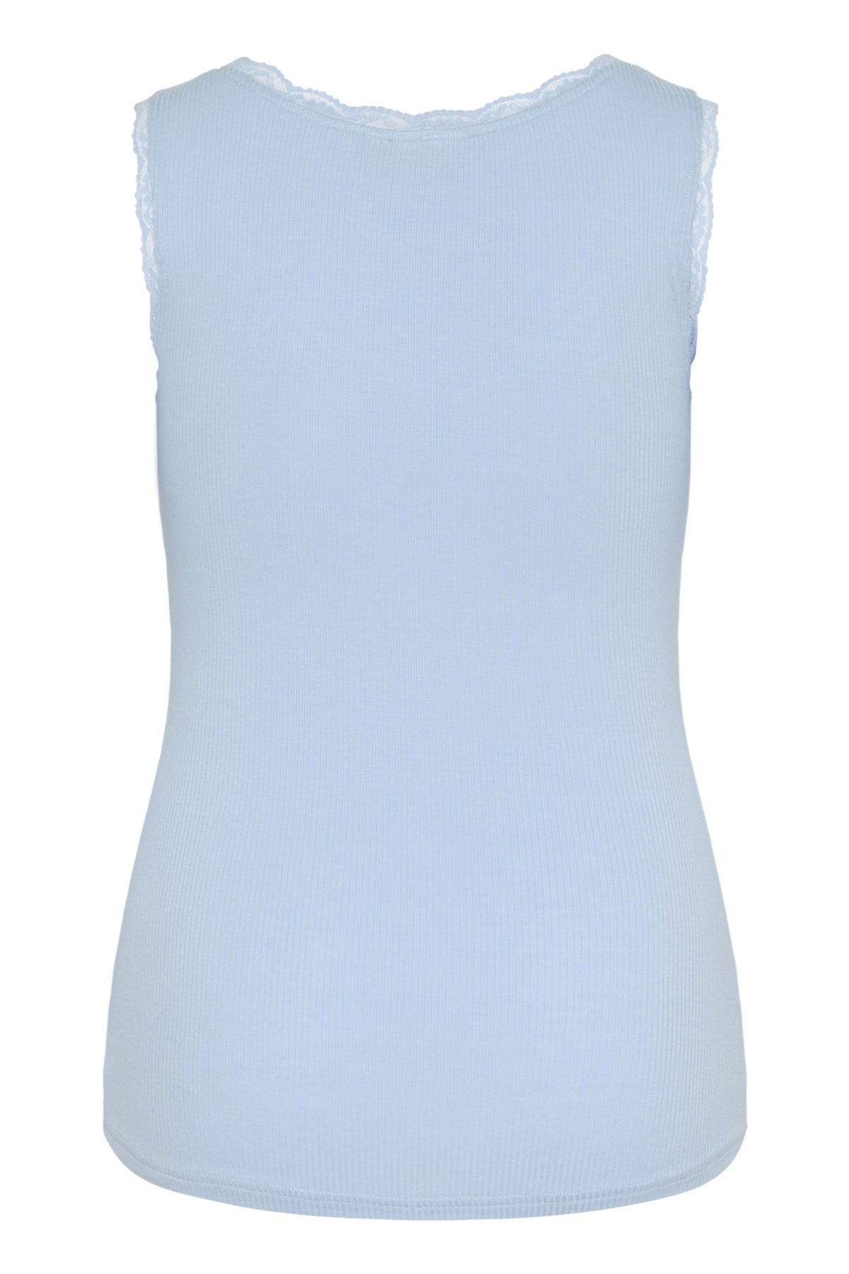 Fínleg blúnda við hálsmálið og yfir hlýrann.