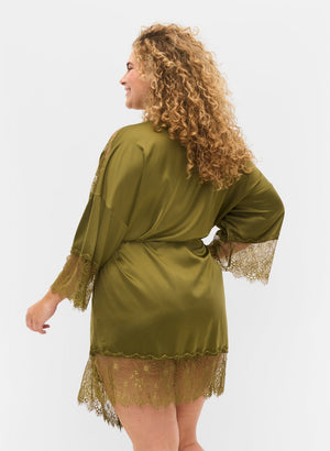 Vandaður ólífu-grænn satín kimono sloppur með fallegri blúndu.
