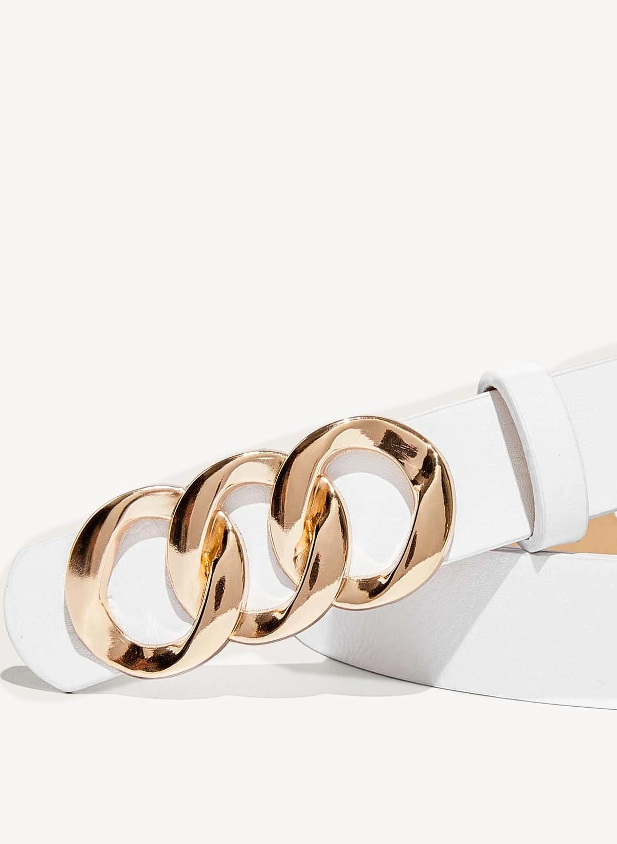 Pleður belti með gylltum skrauthringjum að framan.