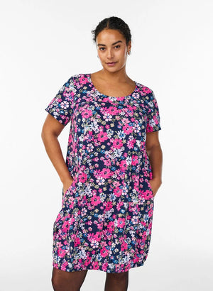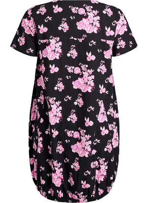 Bómullarkjóll með stuttum ermum, laus teygja neðst niðri og vasar að framan.