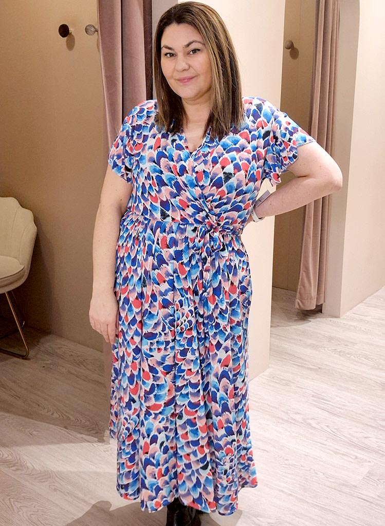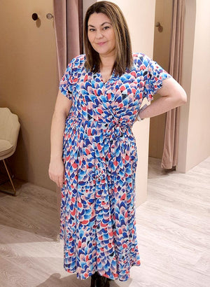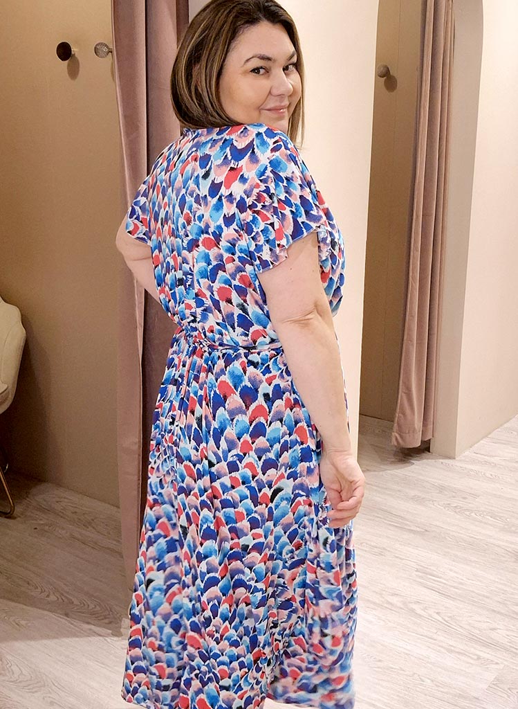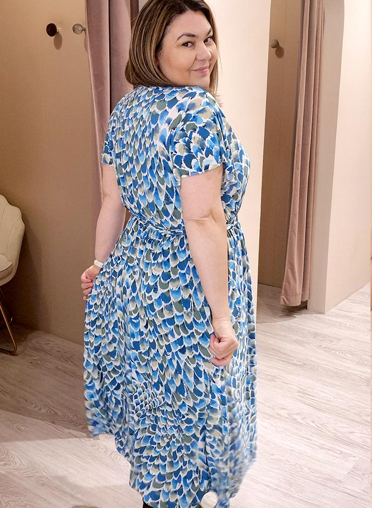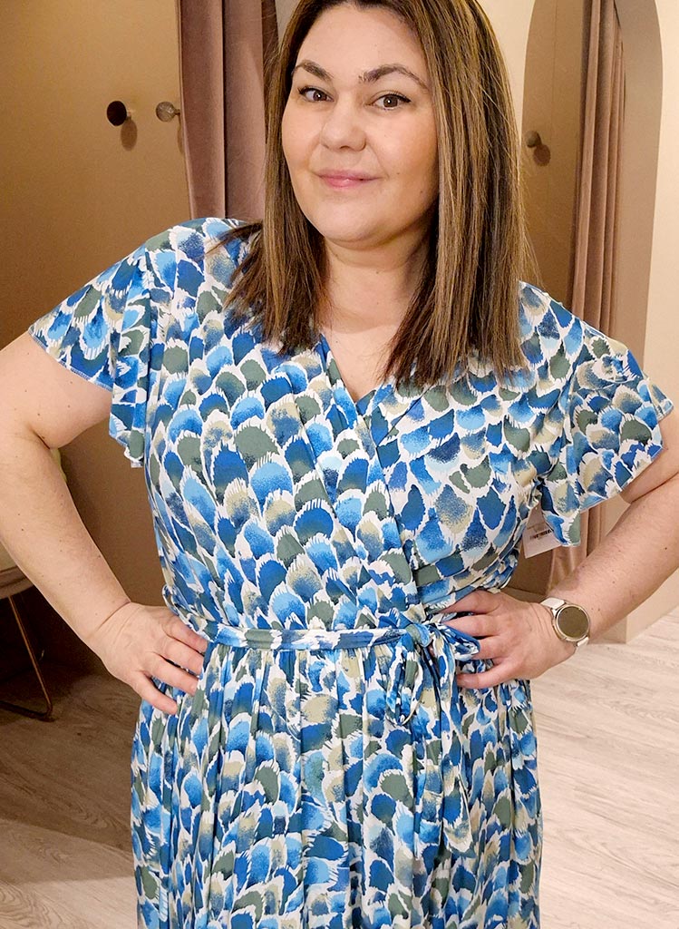 Wrap hálsmál, teygja í mittinu og mjög góð teygja í efninu.