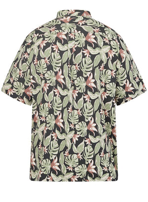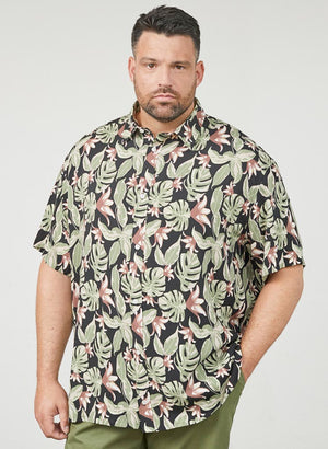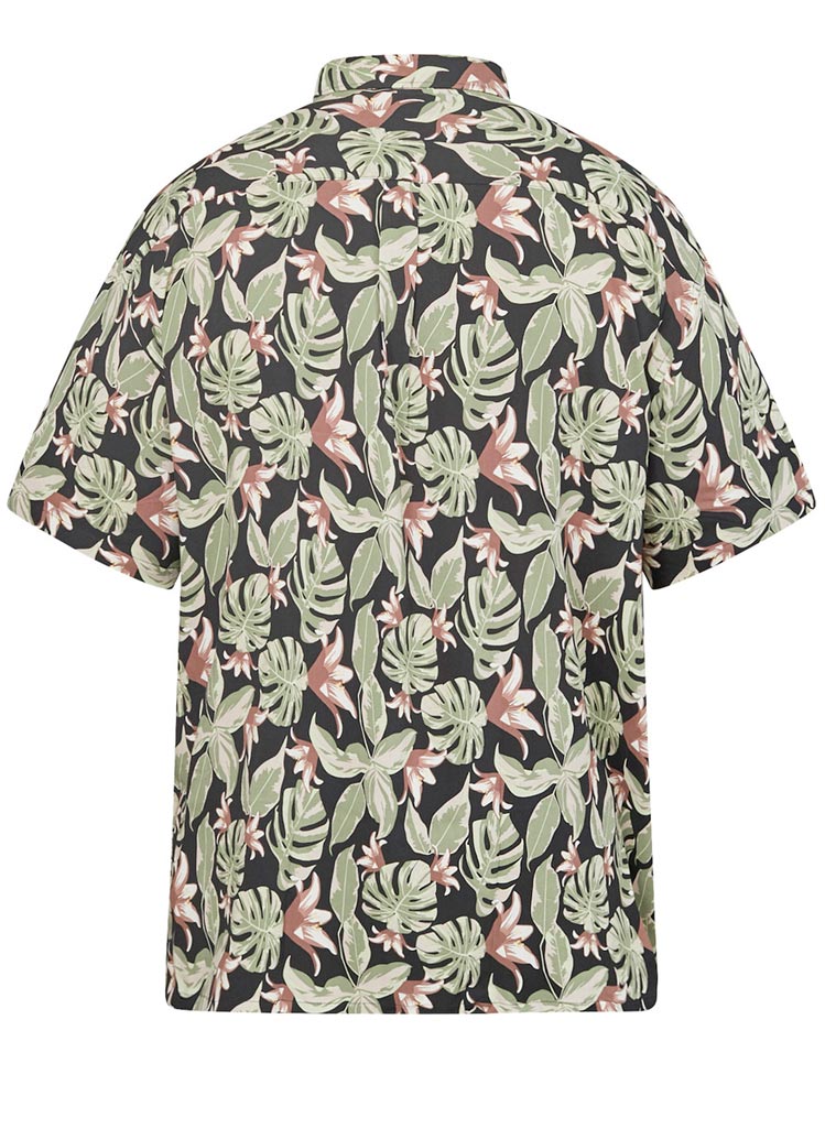 Skyrtan er dökk í grunninn með palma og hawaii mynstri